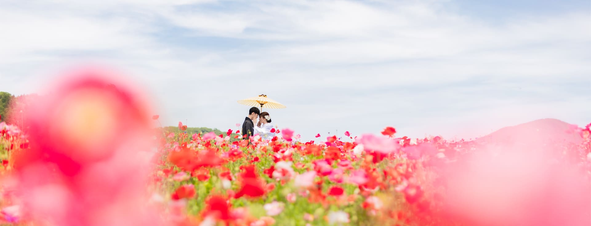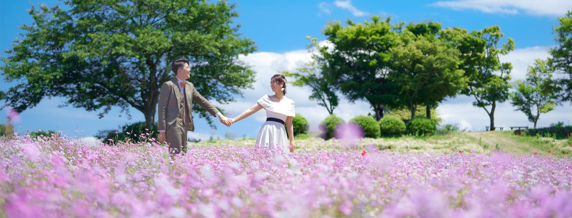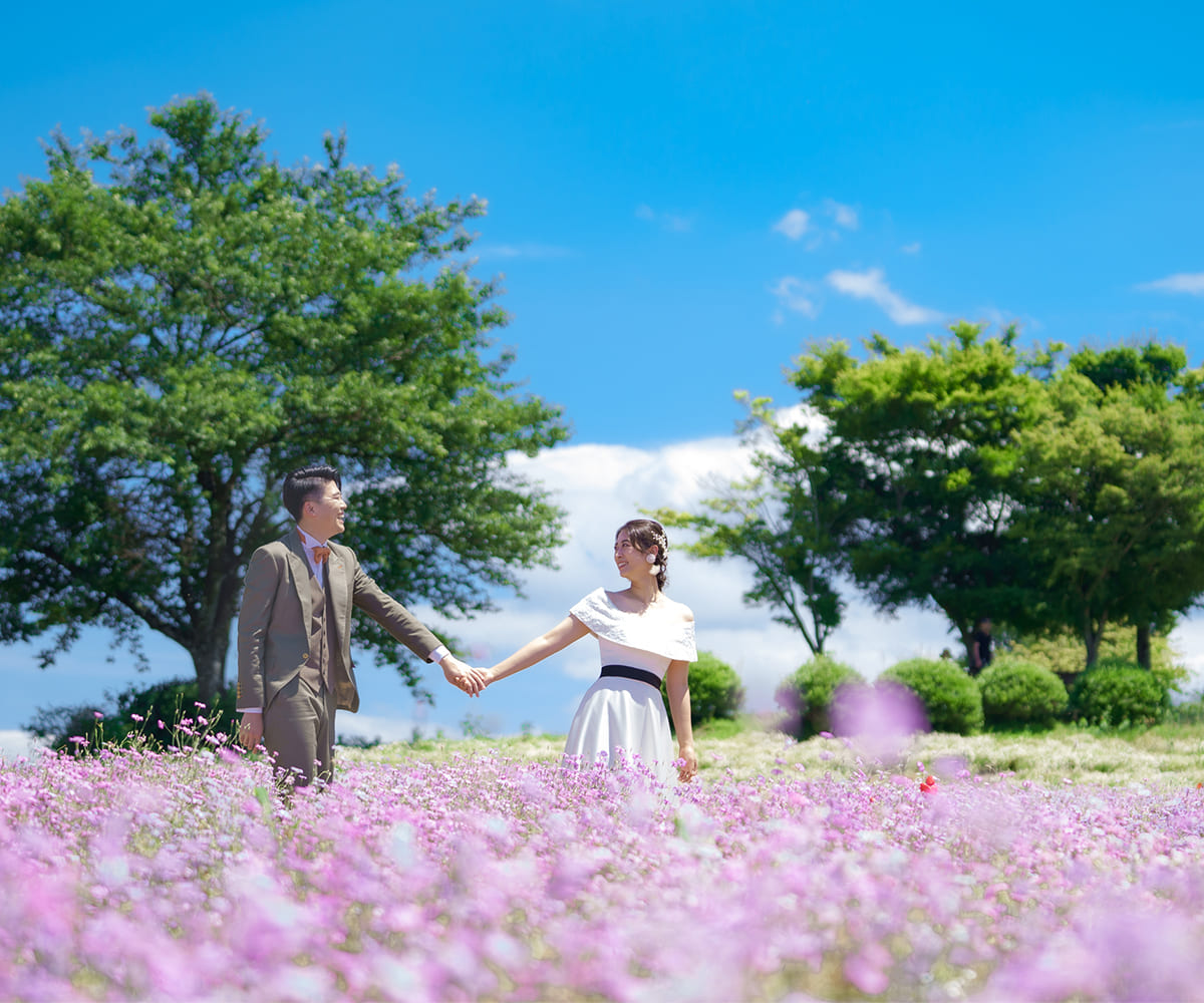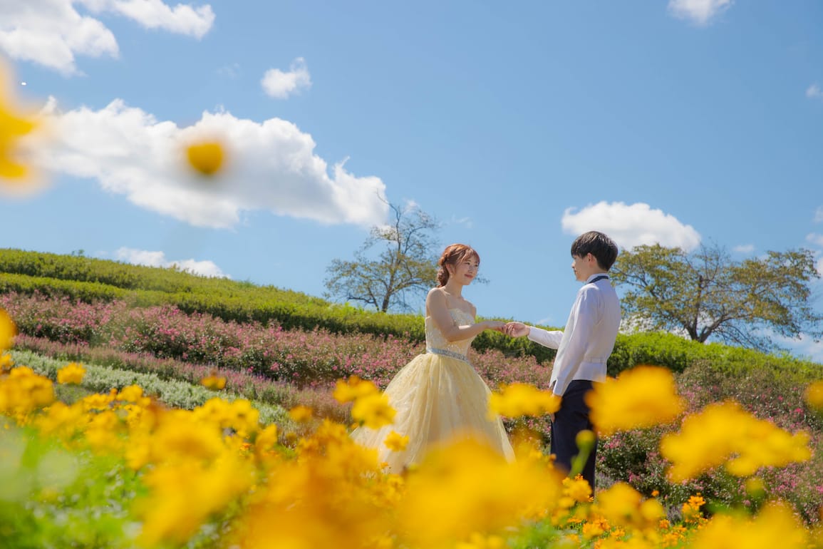 景色一面に花々が咲き誇る花畑で撮影するウエディングフォトは、映画のようにロマンチックな特別な一枚に。季節や花ごとにお写真の印象が変わり、お二人だけの幸せの瞬間をフォトジェニックに残せます。