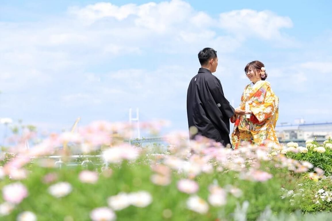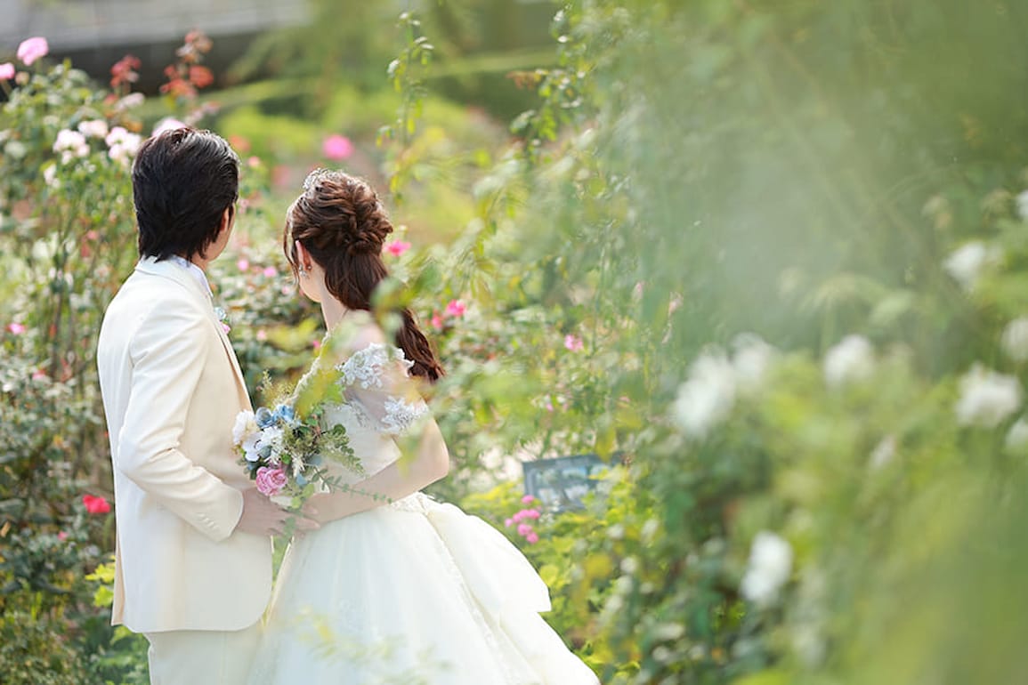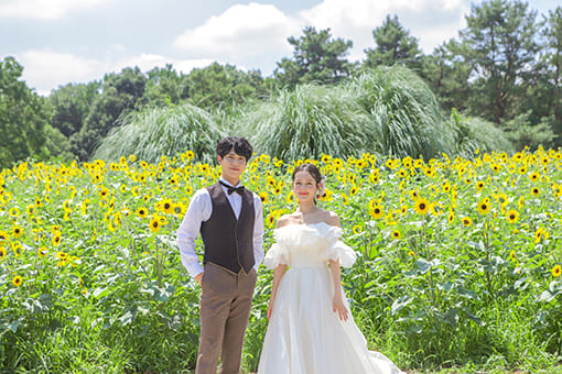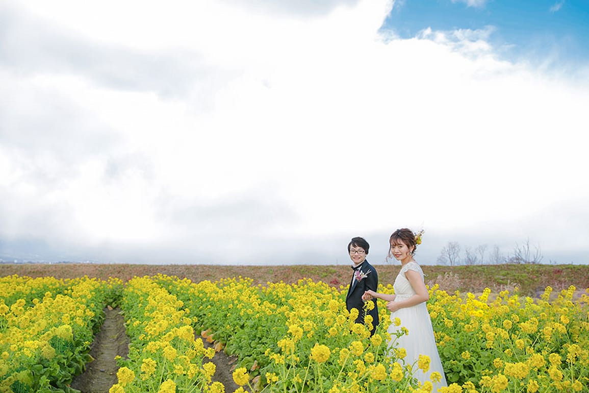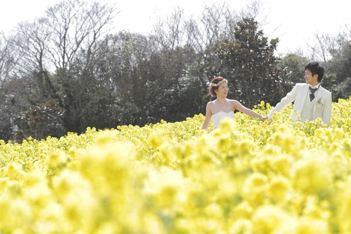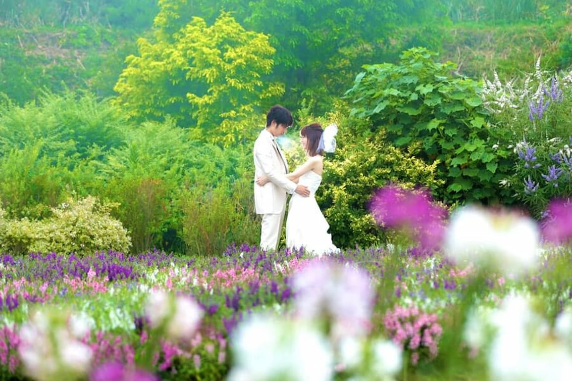 景色一面に花々が咲き誇る花畑で撮影するウエディングフォトは、映画のようにロマンチックな特別な一枚に。季節や花ごとにお写真の印象が変わり、お二人だけの幸せの瞬間をフォトジェニックに残せます。
