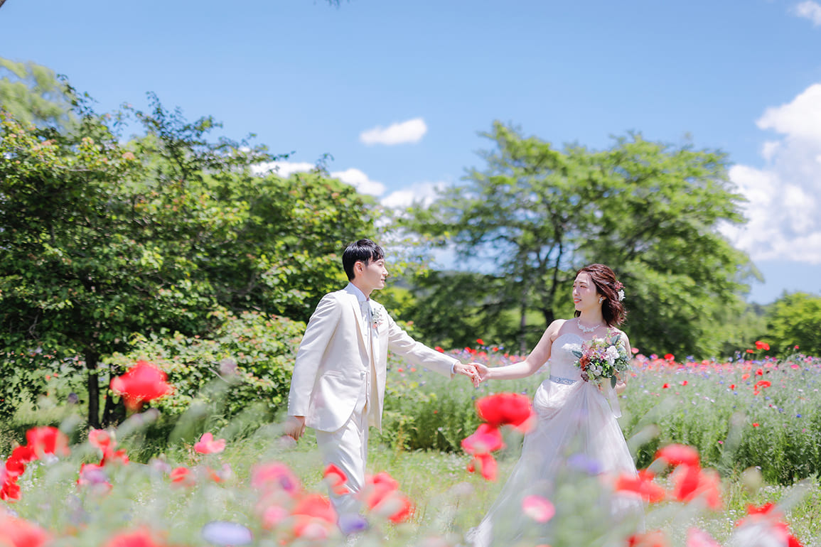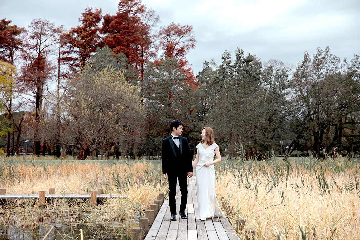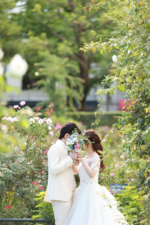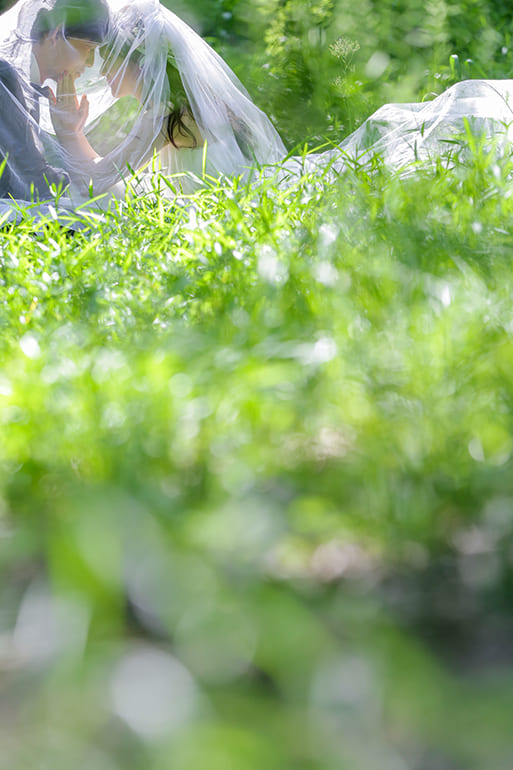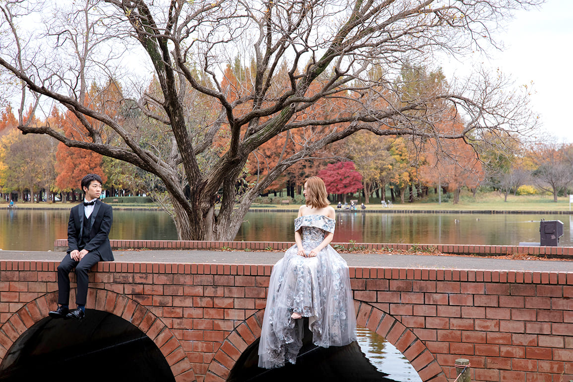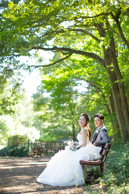 四季折々の花々や豊かな緑に囲まれた公園は、ナチュラルで温かい雰囲気だけでなく、森林の中での撮影のような神秘的な雰囲気を作ることもできます。伸び伸びと撮影がしやすく、デートのようなリラックスした雰囲気の中で、お二人の自然体な姿をフォトジュニックに残しませんか?