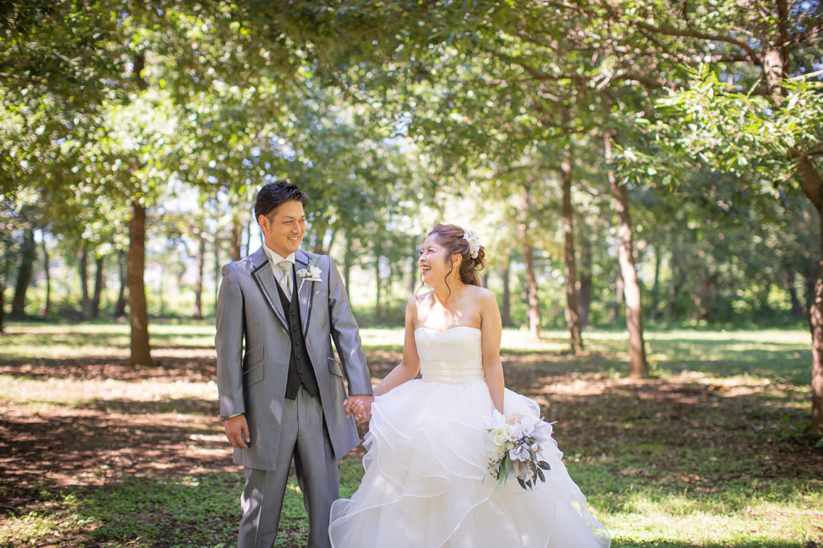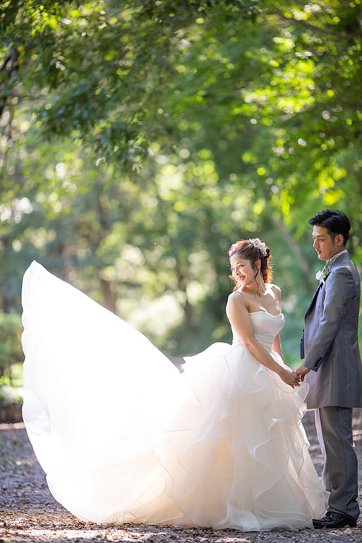 瑞々しい緑の葉にはウェディングドレスの白が日の光を受けて一層美しく映えます。Aラインやエンパイアラインなどを選んでいただくと、動きやすく軽やかな印象になります。