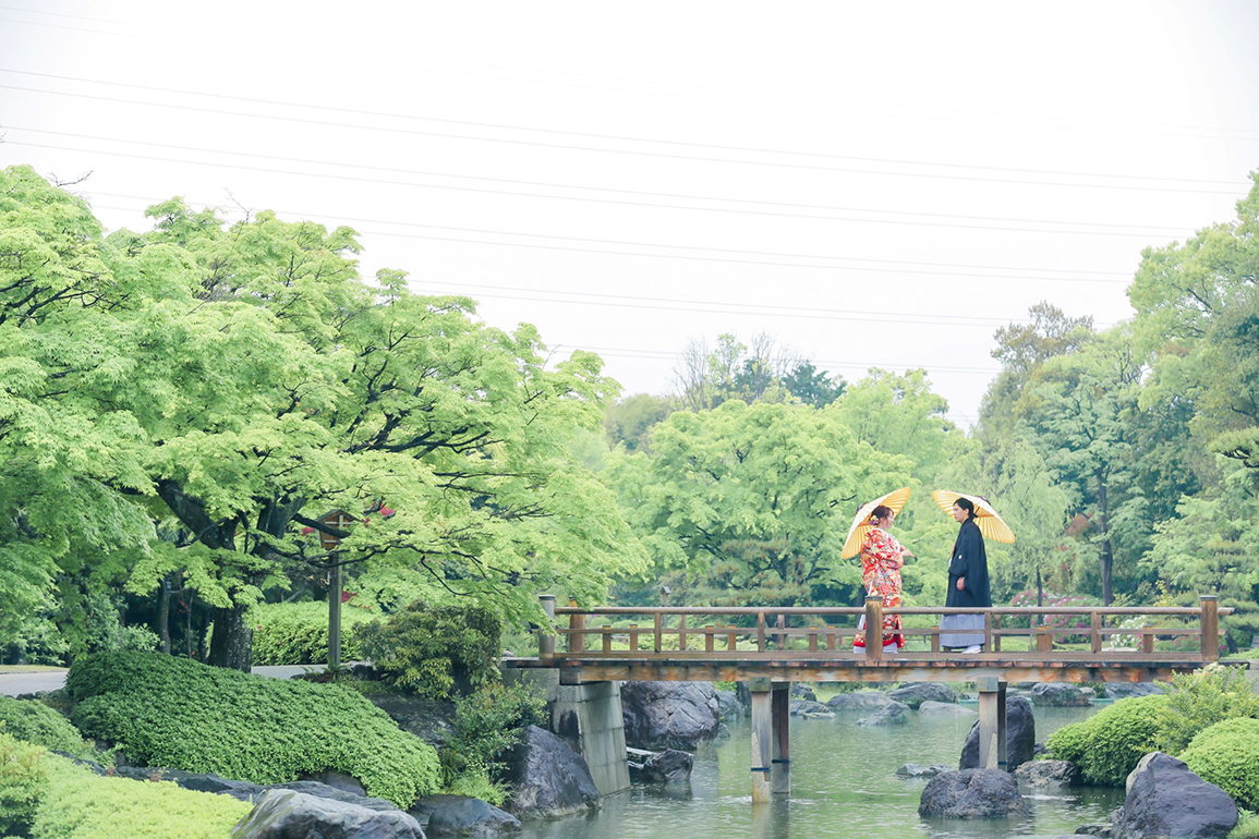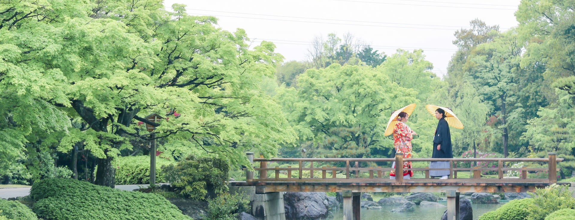 庭園で撮影ができるおすすめのロケーションスポットを集めました。桜や紅葉のシーズンだけでなく、新緑の季節でも瑞々しい風景に和装の美しさが一層引き立ちます。
