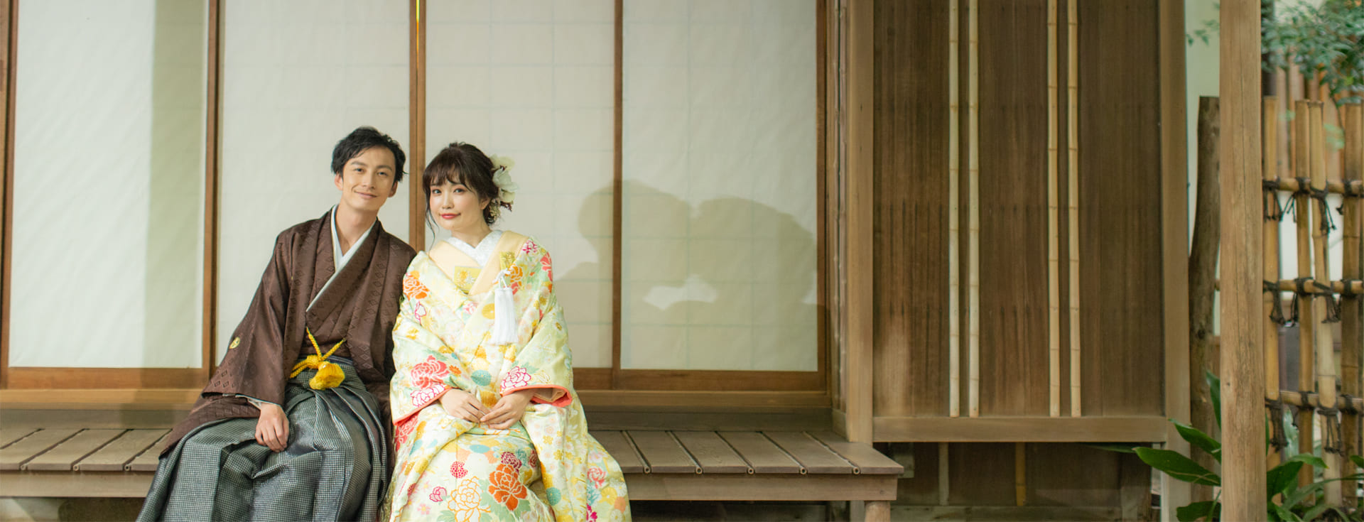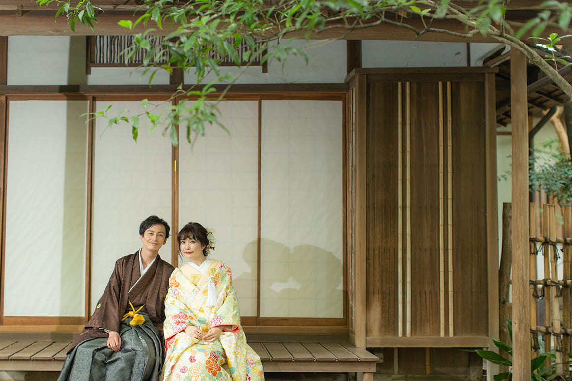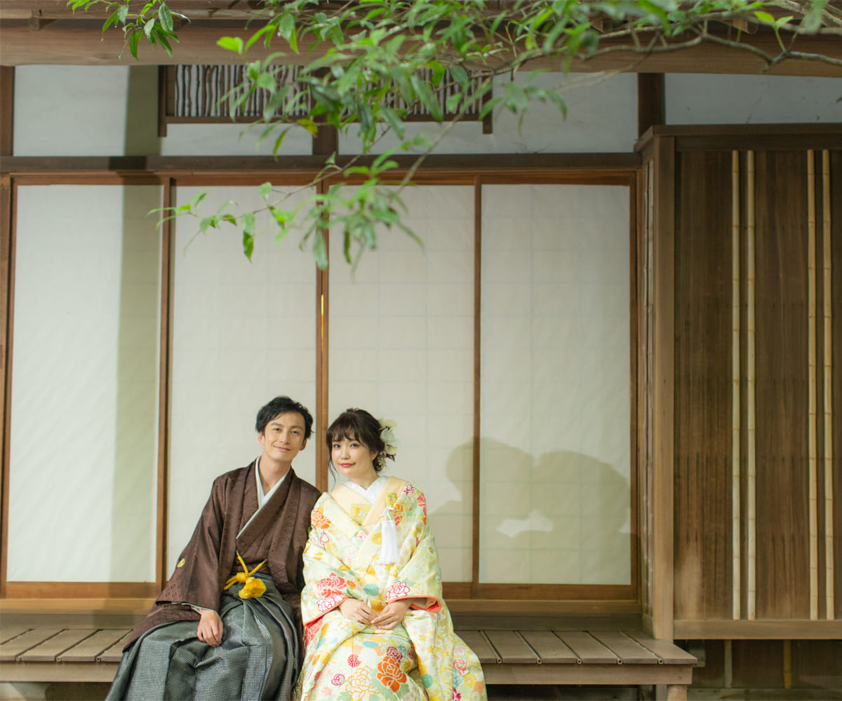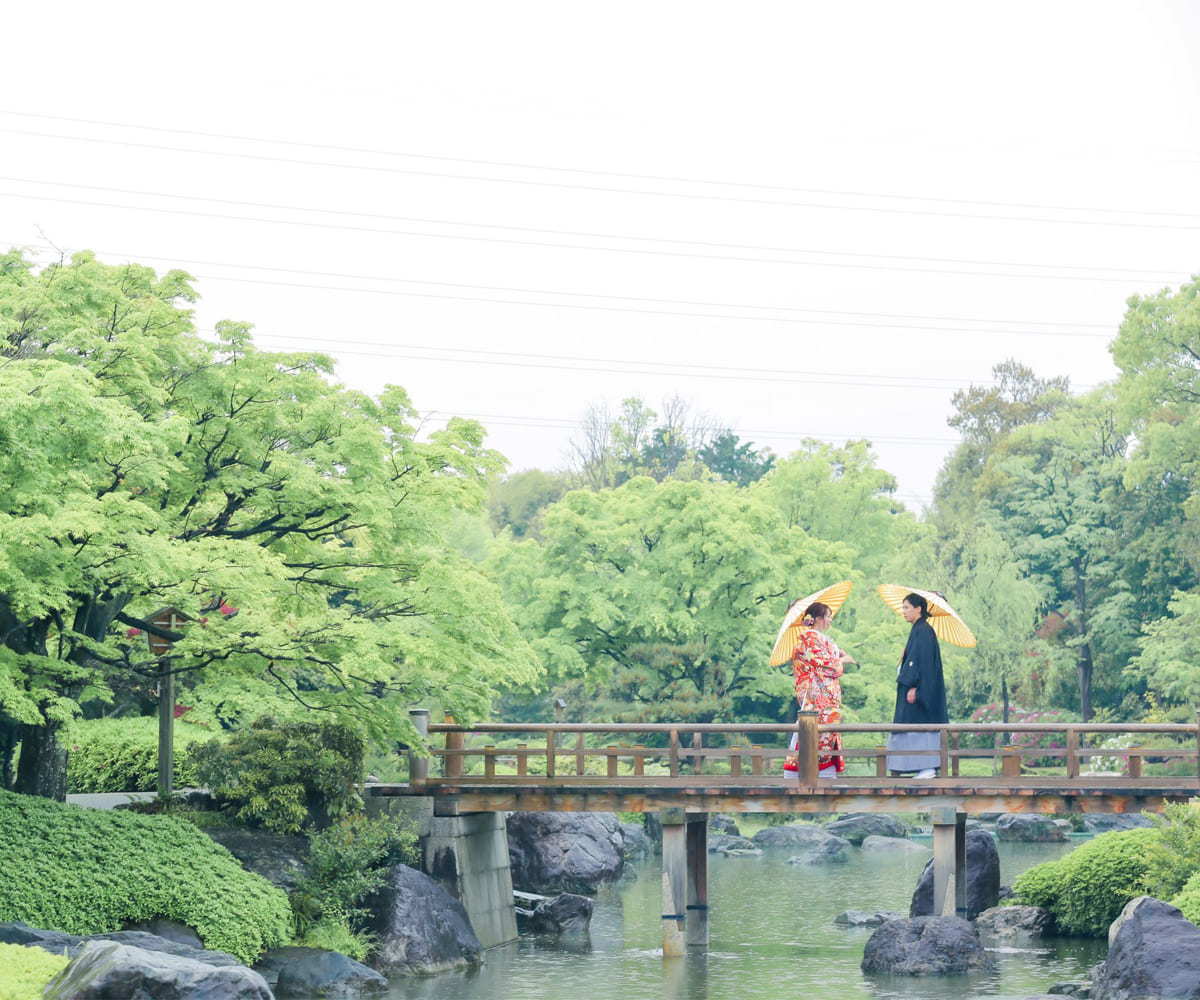日本の美意識が凝縮され、和の趣と静けさに包まれた庭園は、和装のロケーション撮影の定番です。緑の松、池にかかる橋、季節の木々や花々など全ての要素が庭園を和やかに歩くお二人の姿を清らかに映します。和室での撮影も同時に叶うスポットも多いです。