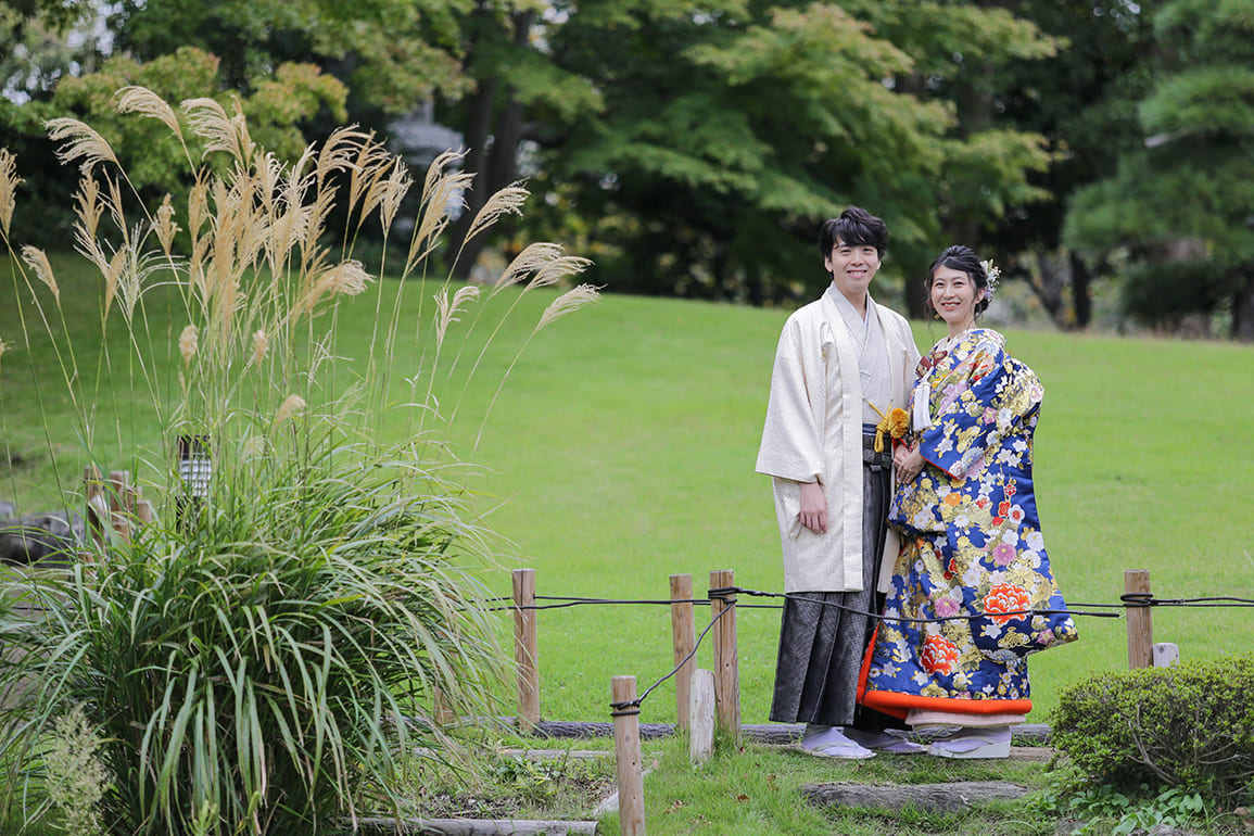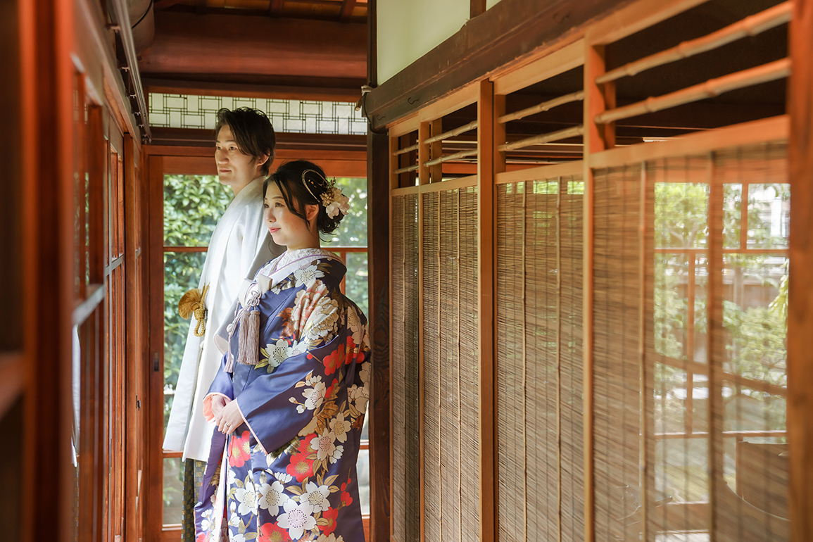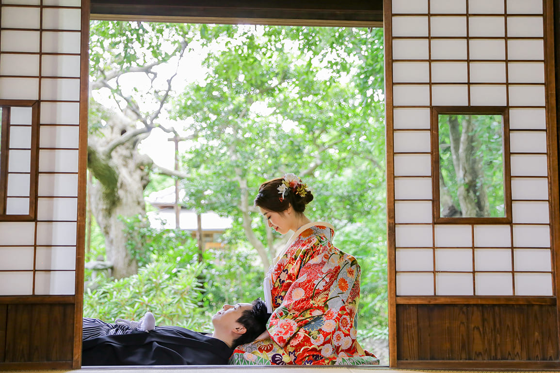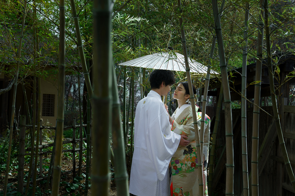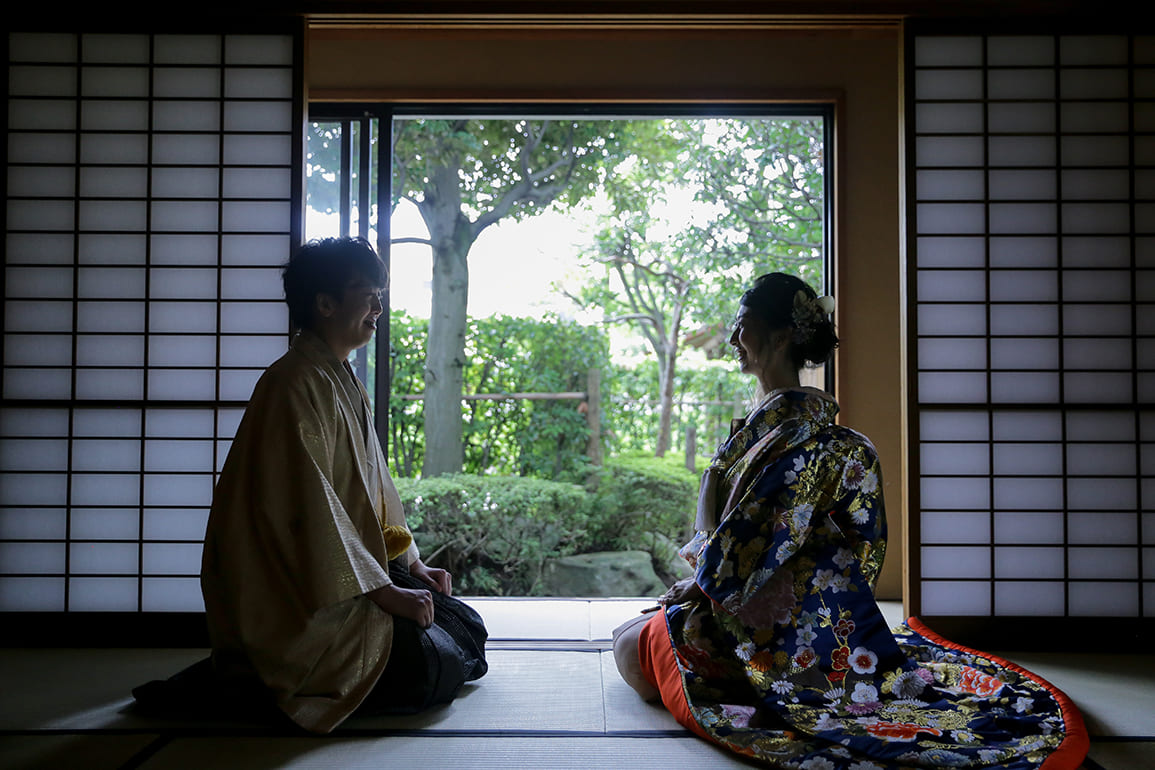 日本の美意識が凝縮され、和の趣と静けさに包まれた庭園は、和装のロケーション撮影の定番です。緑の松、池にかかる橋、季節の木々や花々など全ての要素が庭園を和やかに歩くお二人の姿を清らかに映します。和室での撮影も同時に叶うスポットも多いです。