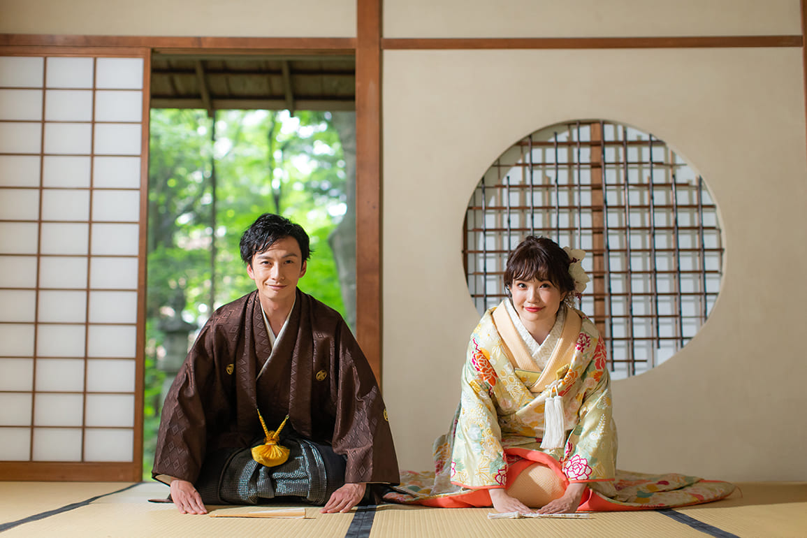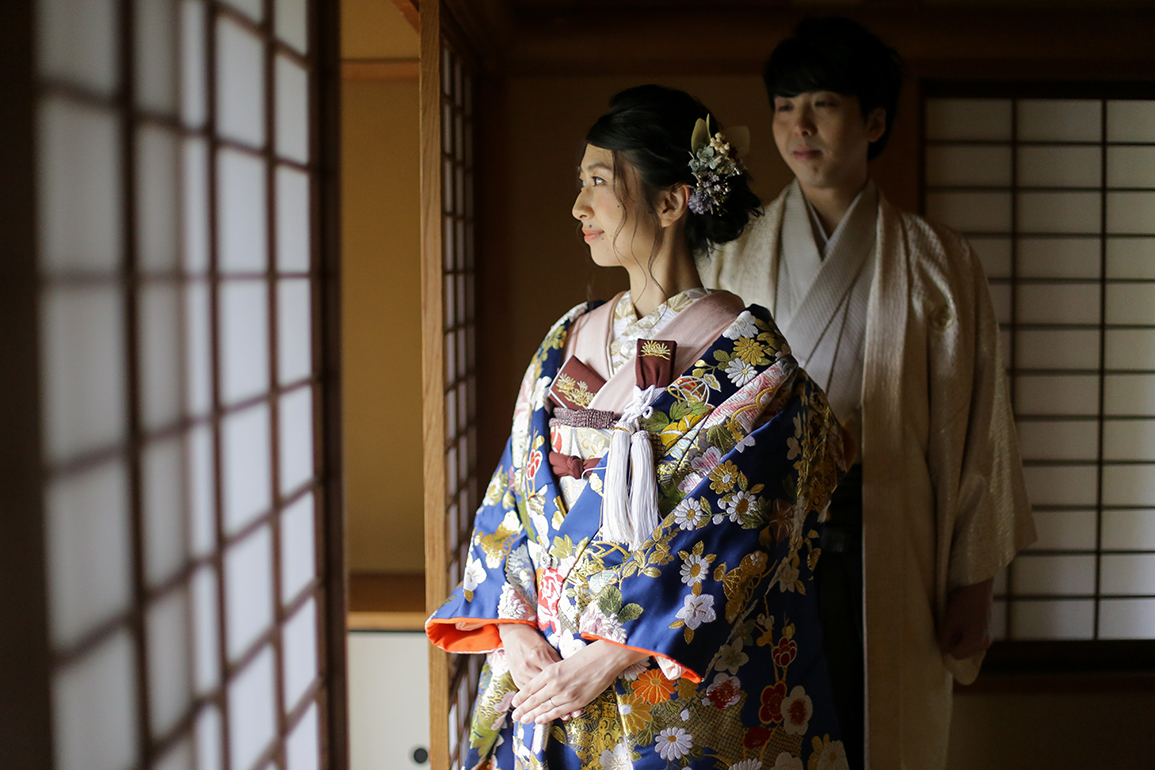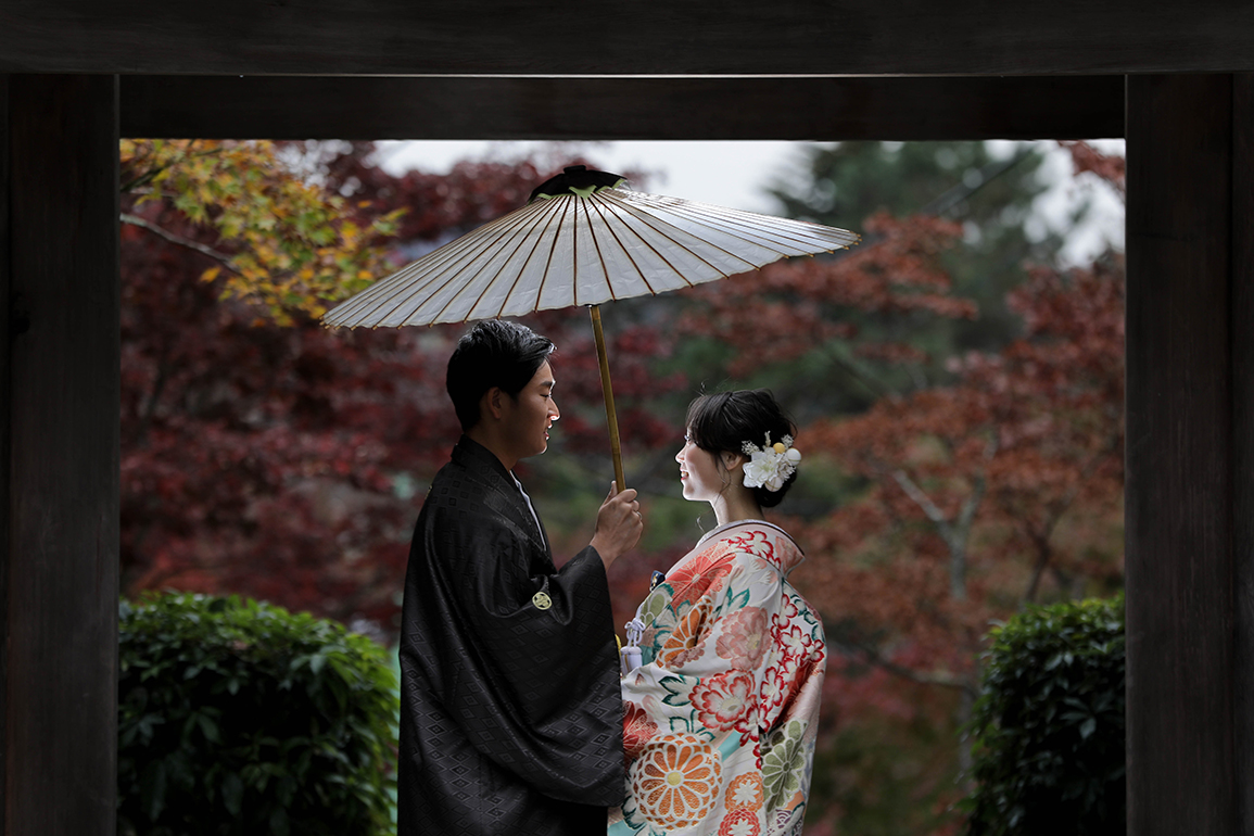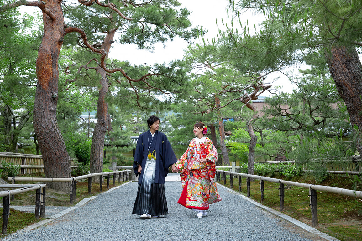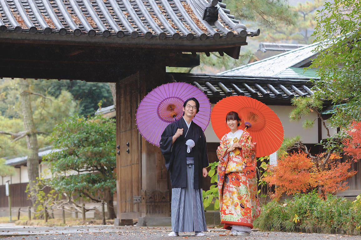 日本の美意識が凝縮され、和の趣と静けさに包まれた庭園は、和装のロケーション撮影の定番です。緑の松、池にかかる橋、季節の木々や花々など全ての要素が庭園を和やかに歩くお二人の姿を清らかに映します。和室での撮影も同時に叶うスポットも多いです。