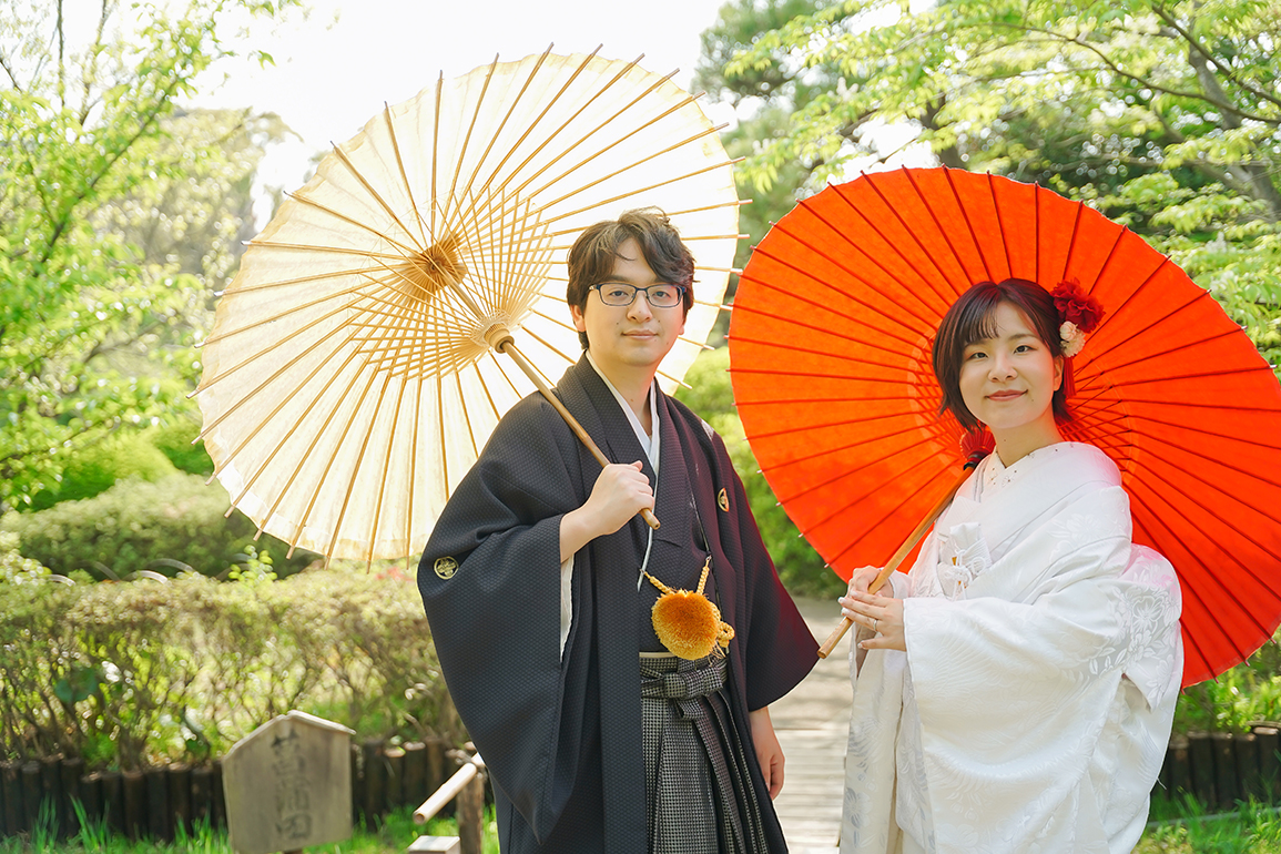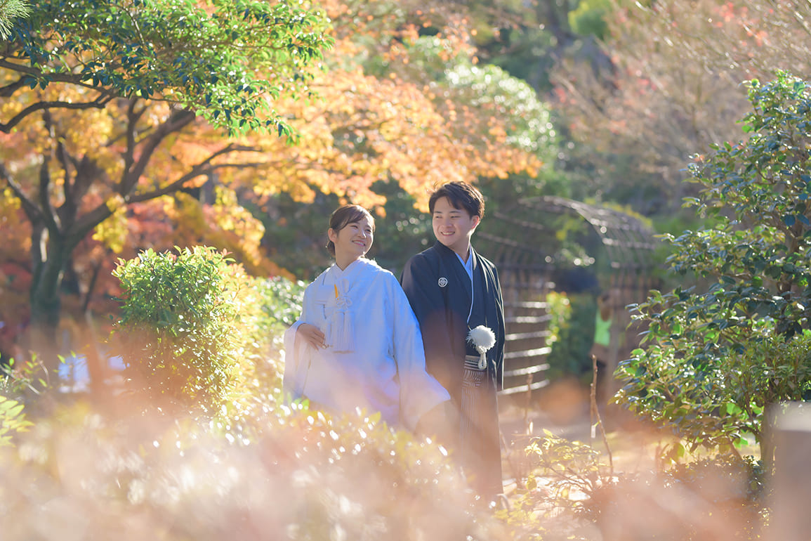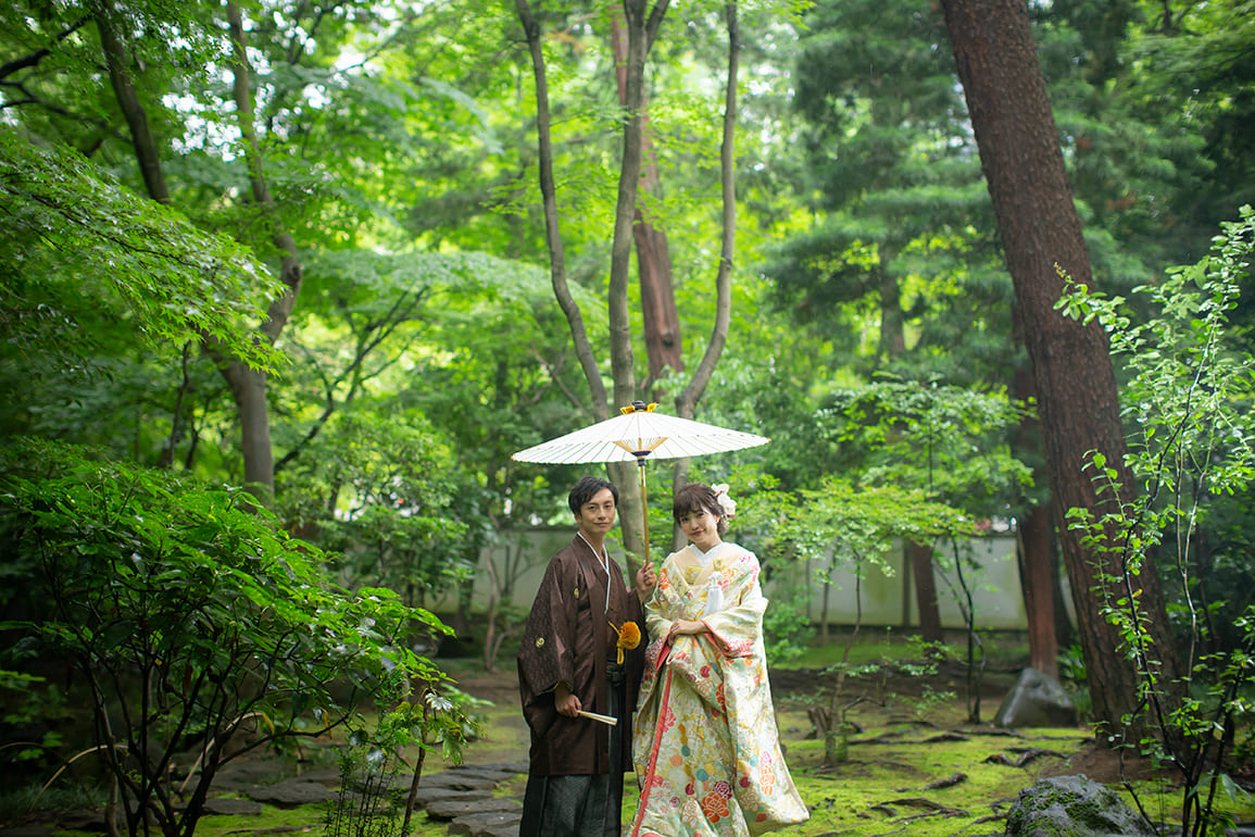 年中美しく撮影できるのが庭園の魅力ですが、花々や新緑の春のシーズン(4〜5月)や、紅葉の秋(11月ごろ)が人気です。夏でも瑞々しい雰囲気で撮影ができ、和室のある庭園では室内で落ち着いて撮影もできます。