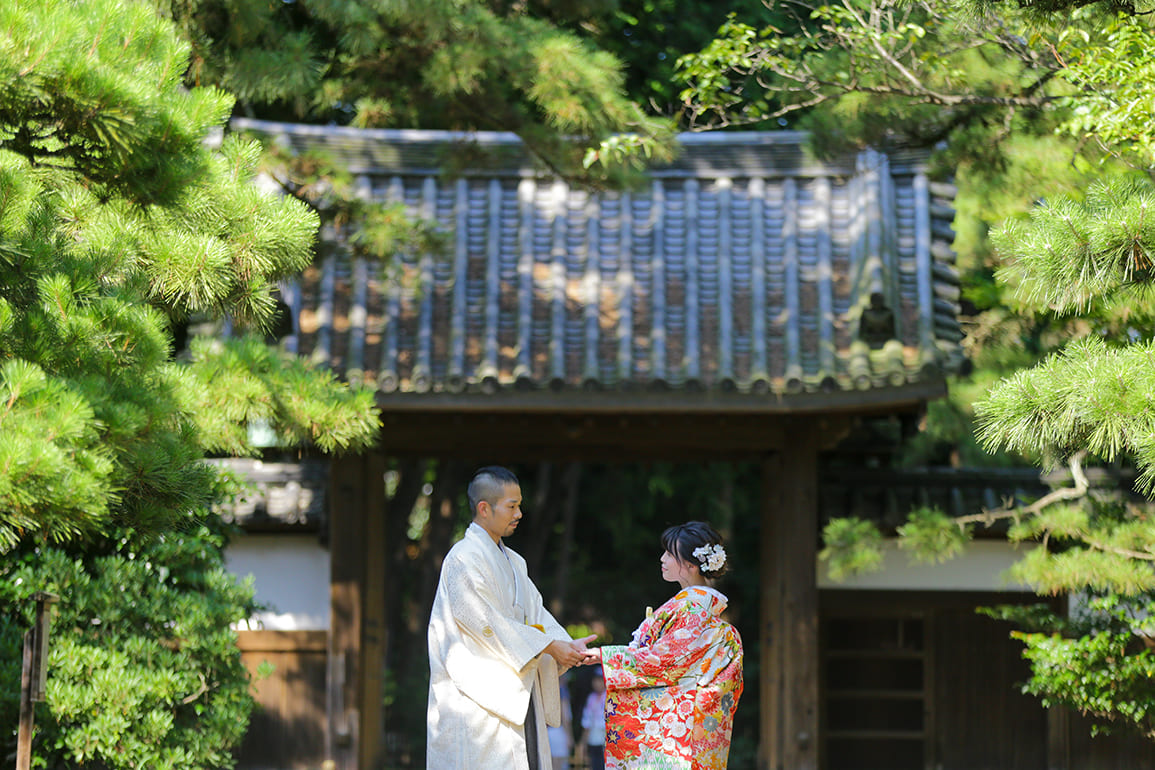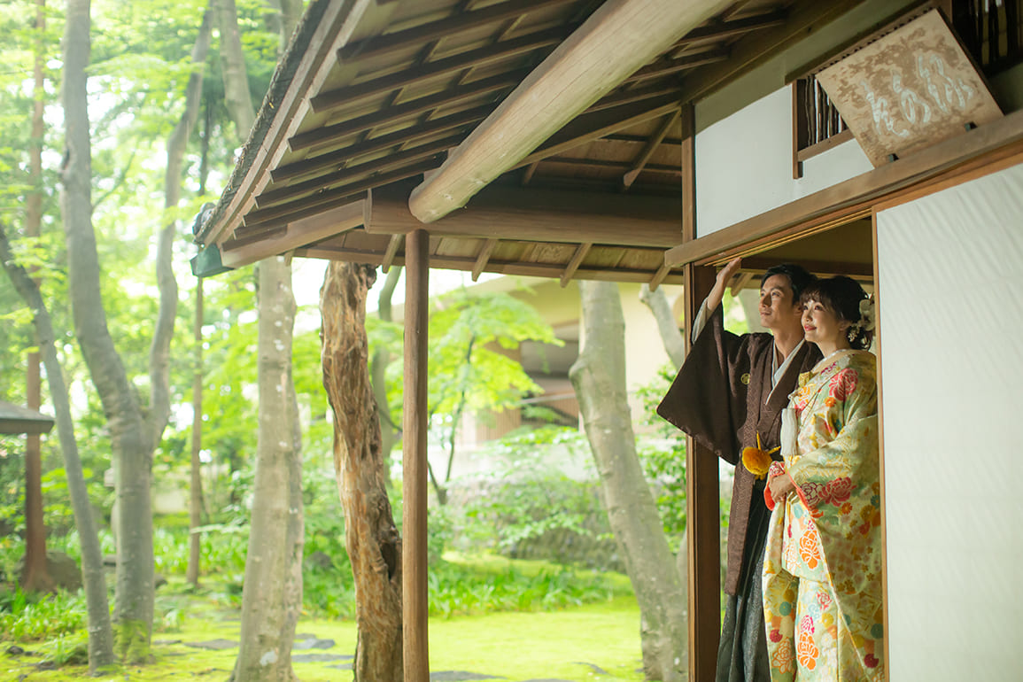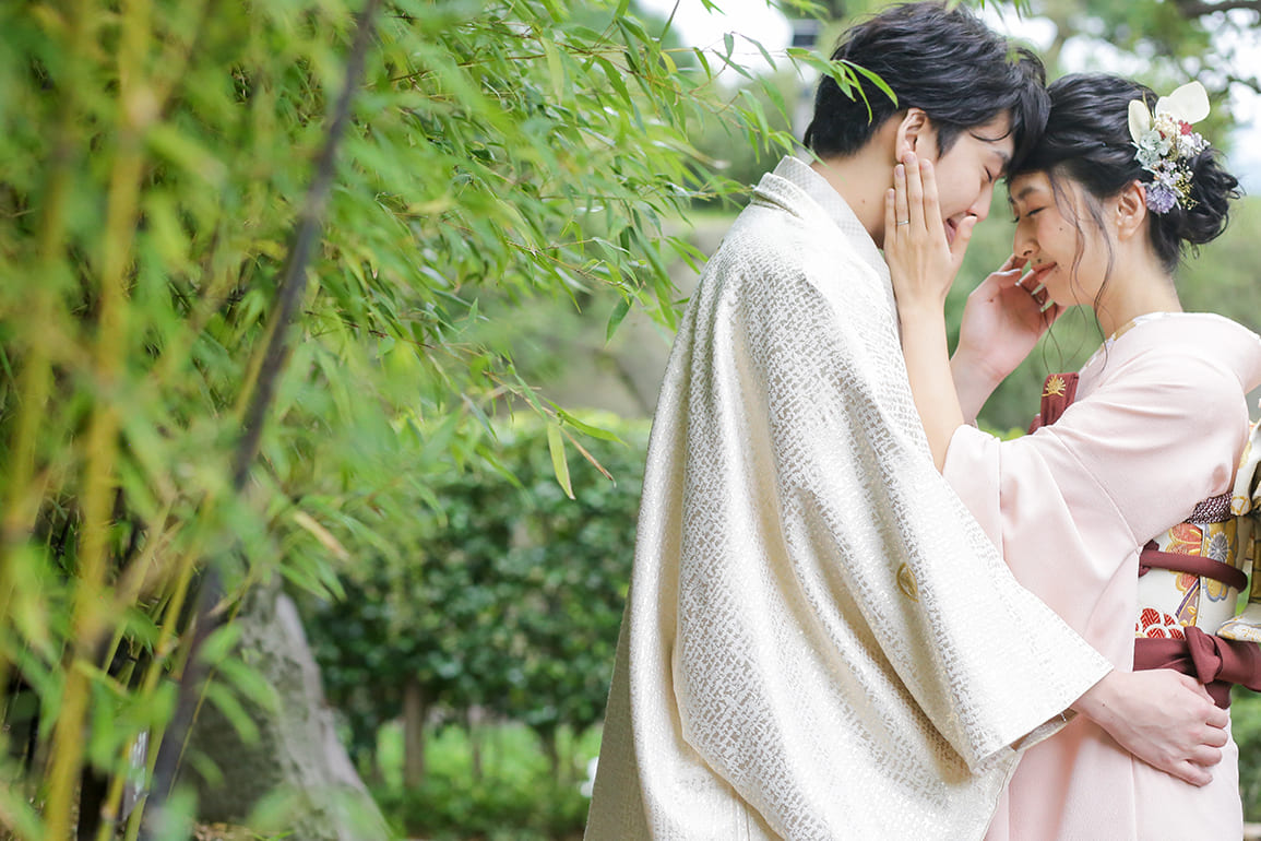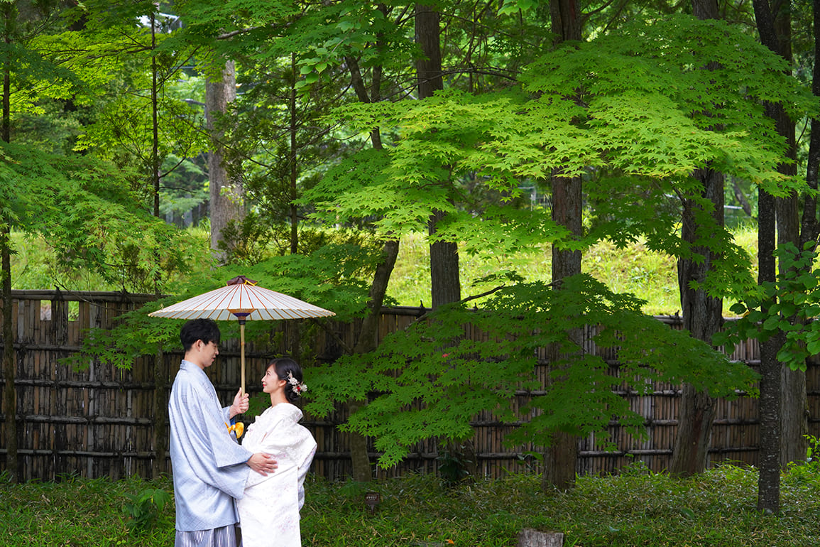 - どんな和装も引き立つロケーション。新緑の季節は白無垢もよく似合います