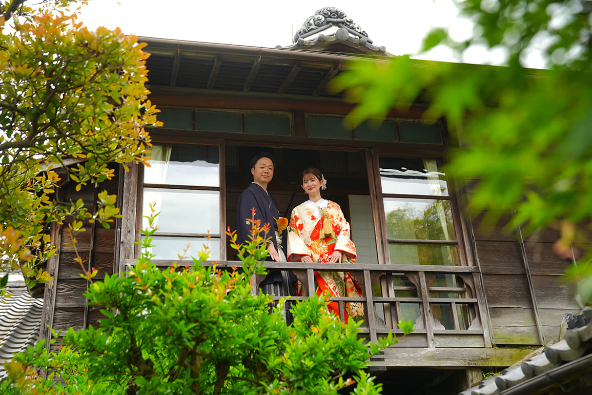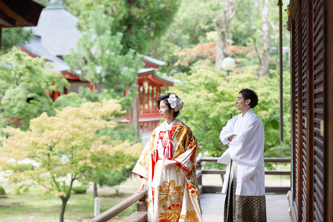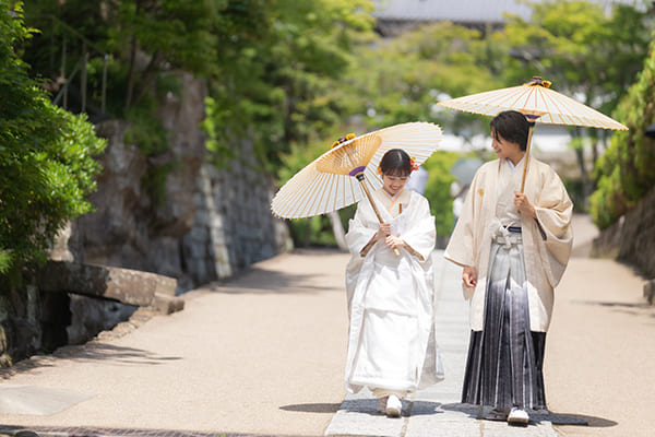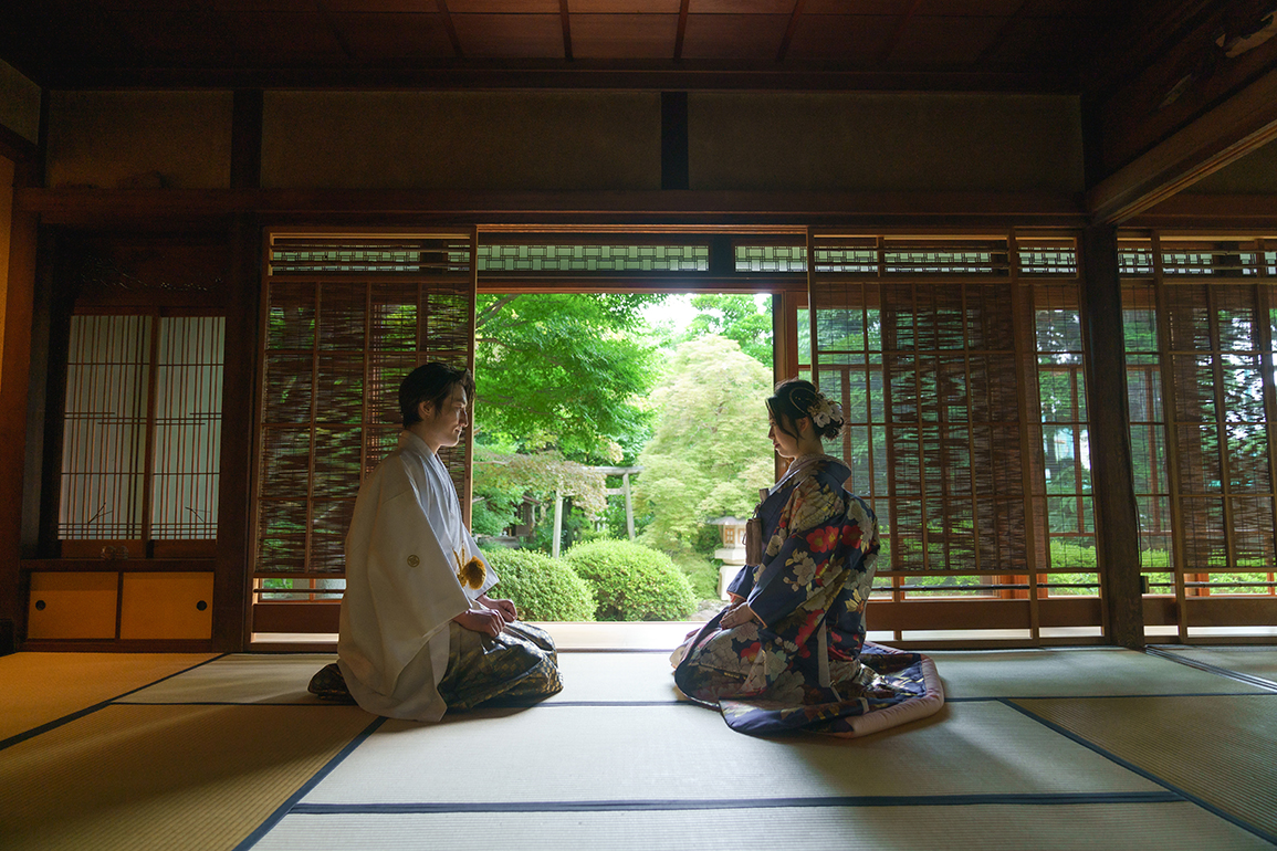 - どんな和装も引き立つロケーション。新緑の季節は白無垢もよく似合います