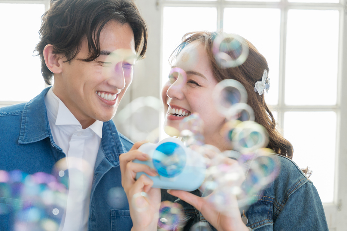 前撮りの撮影の時に、オープニングムービーを意識した撮影をしておくと動画制作がスムーズです。弾ける笑顔や遊び心のある写真は結婚式や披露宴の始まりを華やかに盛り上げてくれます。