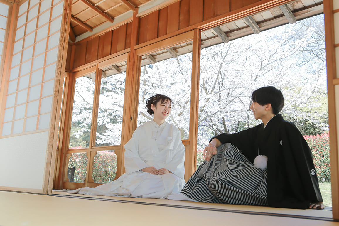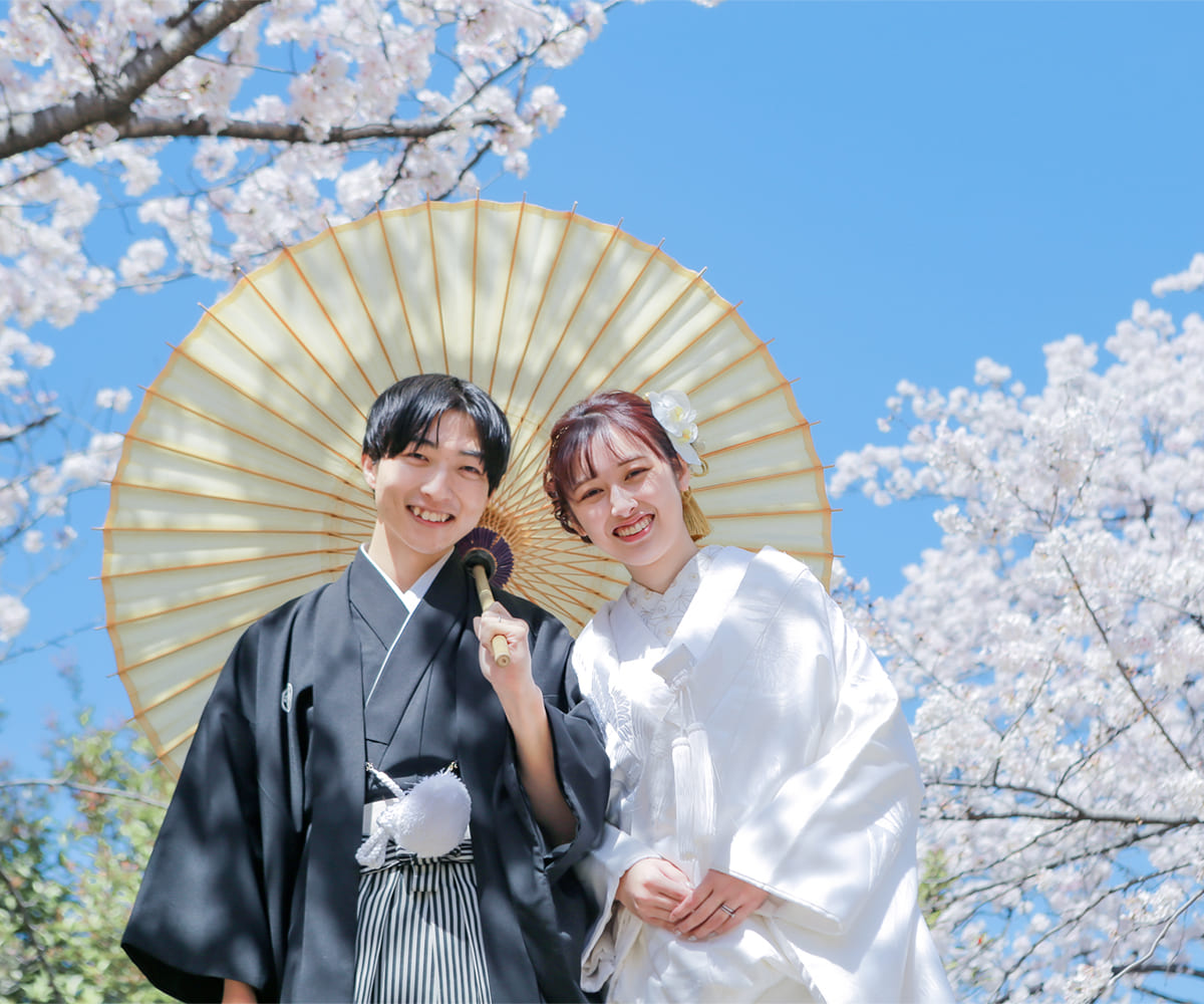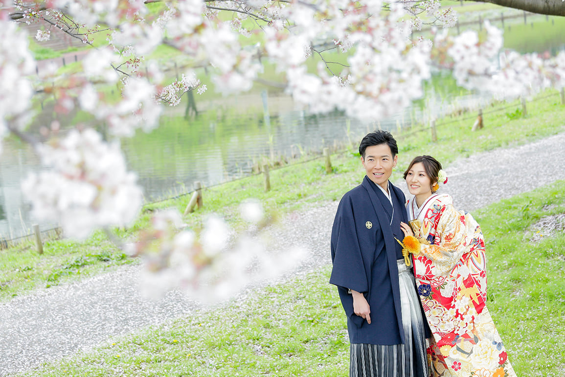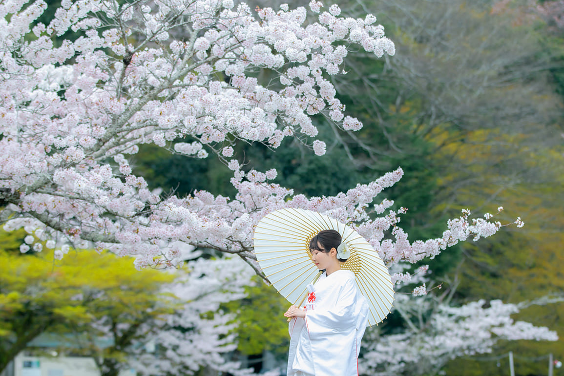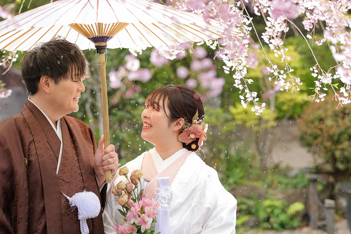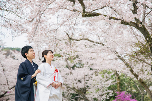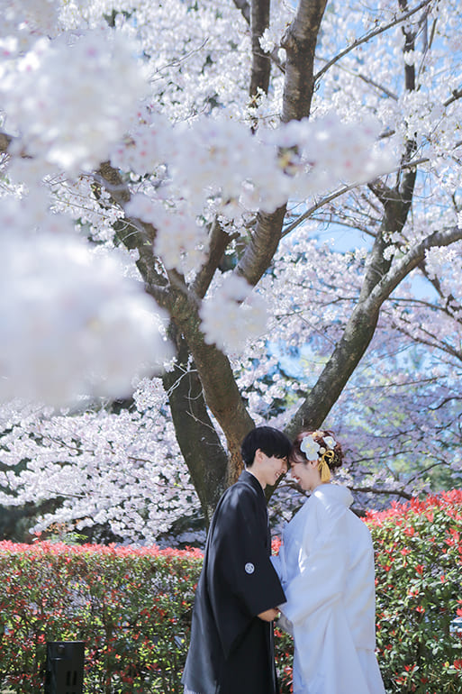 満開の桜の背景には、白無垢や淡い色合いの和装での撮影が人気です。庭園などの奥ゆかしい景色も混ざるロケーションでは赤色などの定番の打ち掛けも一層映えます。