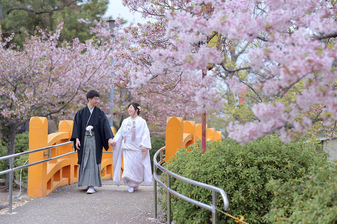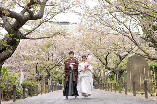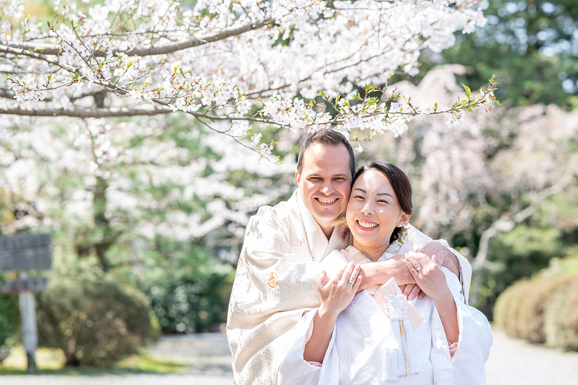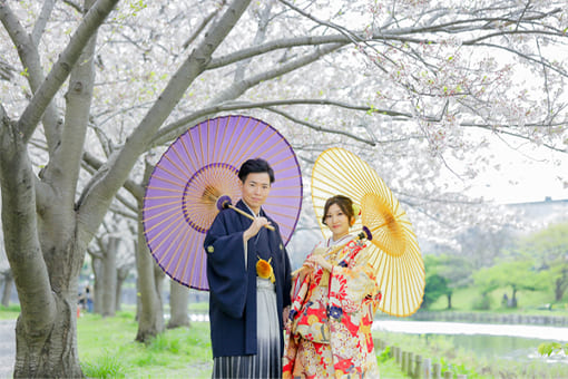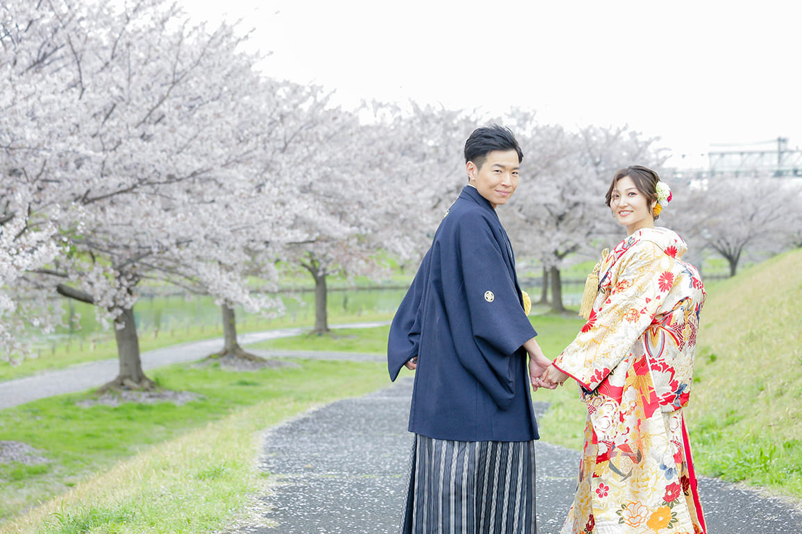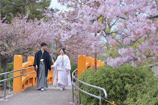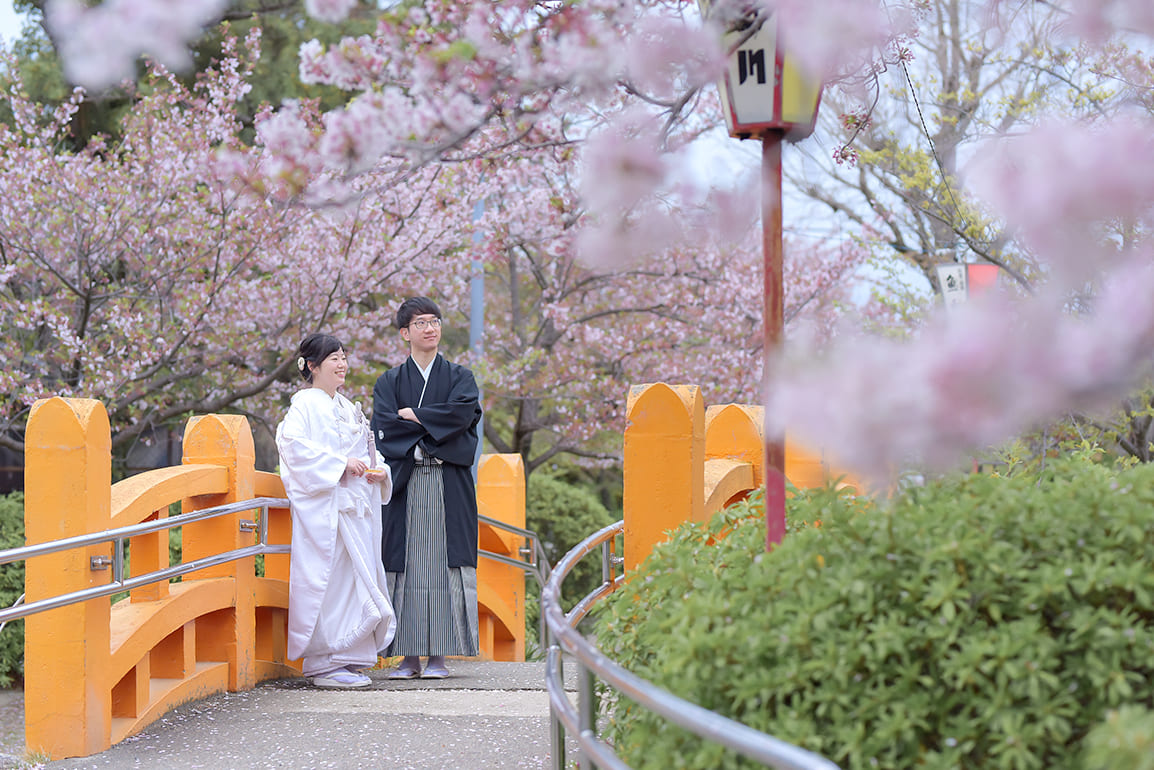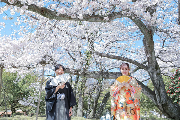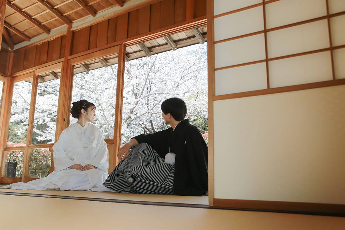 満開の桜の背景には、白無垢や淡い色合いの和装での撮影が人気です。庭園などの奥ゆかしい景色も混ざるロケーションでは赤色などの定番の打ち掛けも一層映えます。