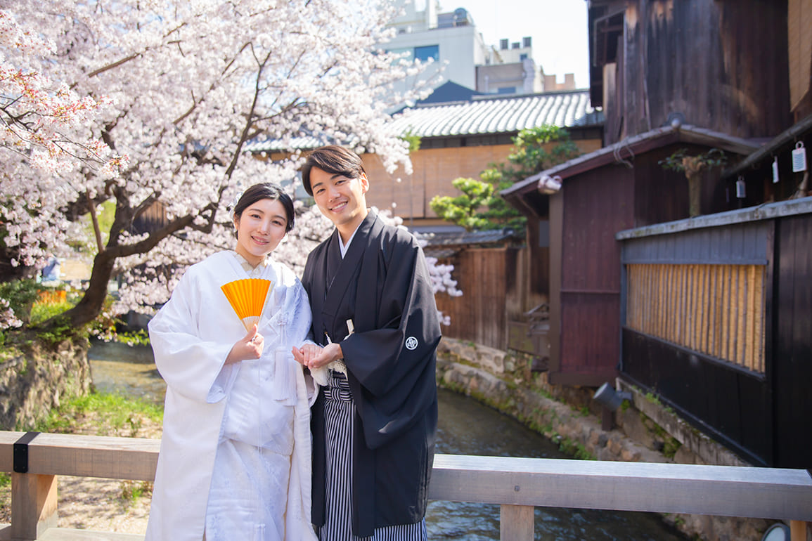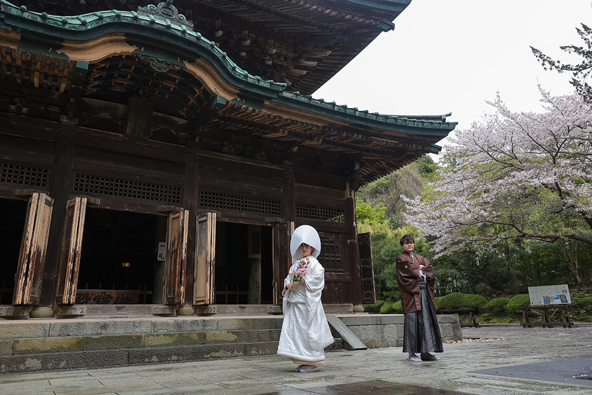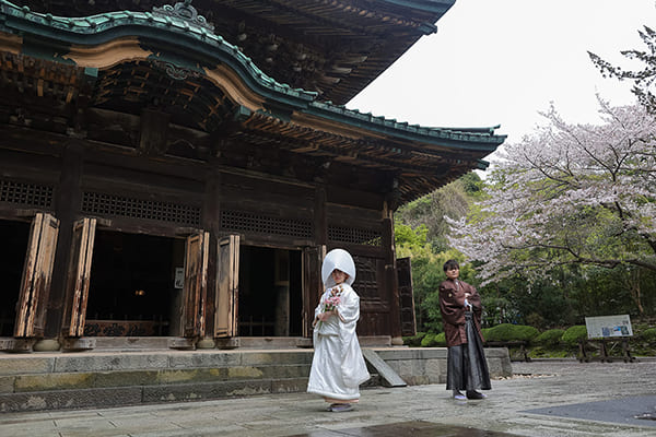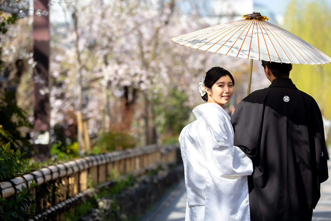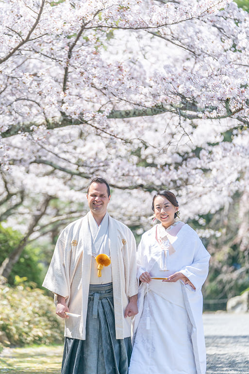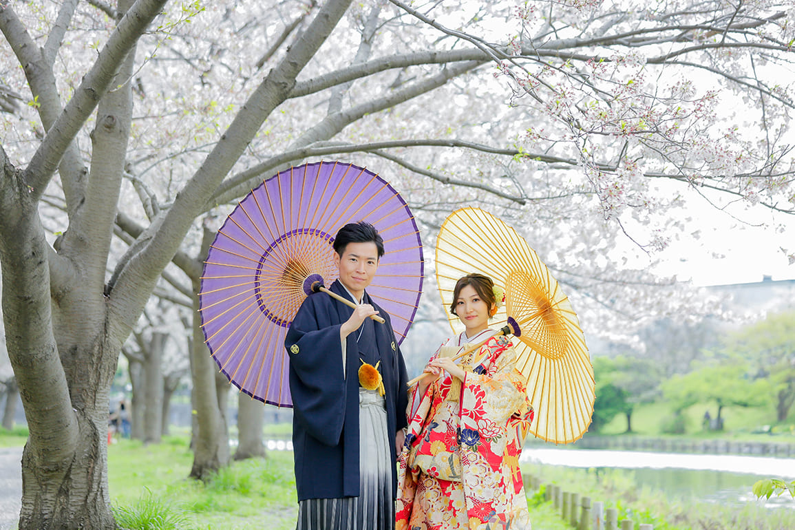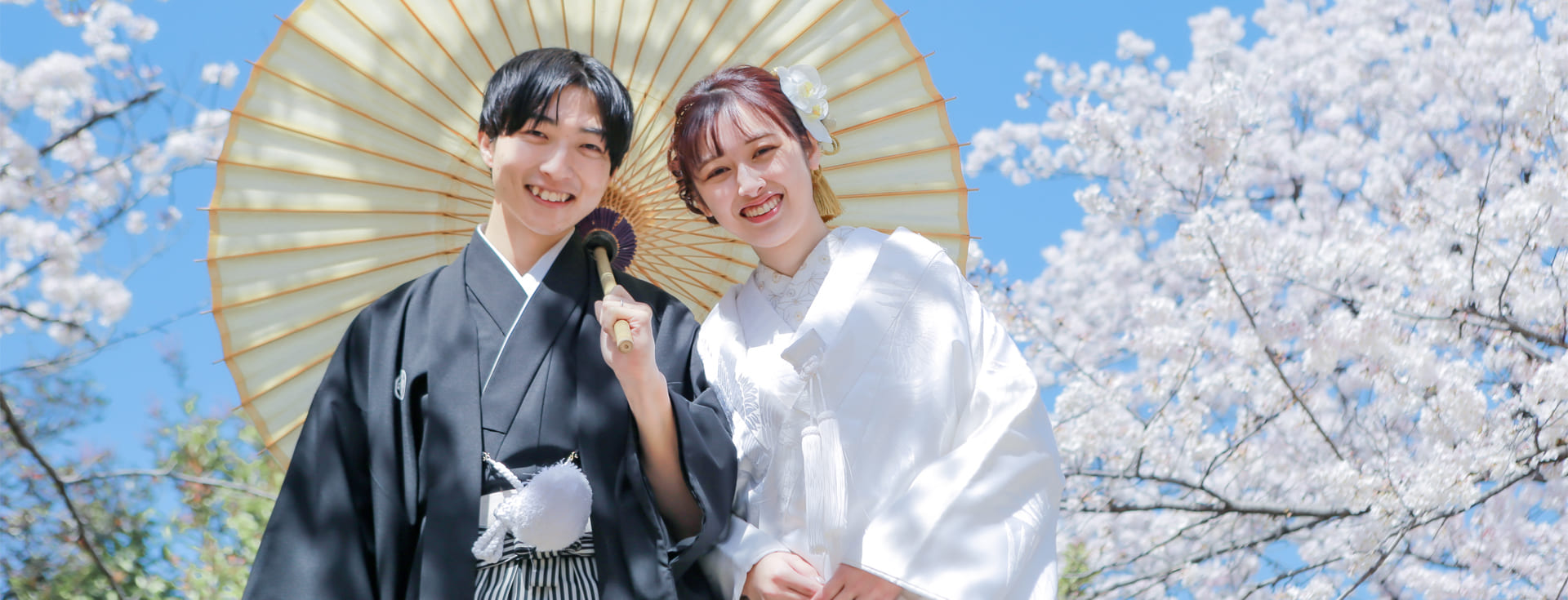 満開の桜の背景には、白無垢や淡い色合いの和装での撮影が人気です。庭園などの奥ゆかしい景色も混ざるロケーションでは赤色などの定番の打ち掛けも一層映えます。