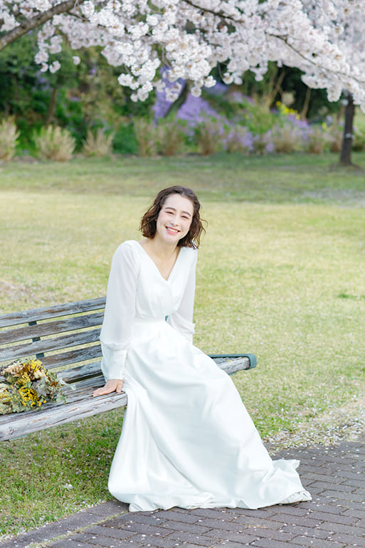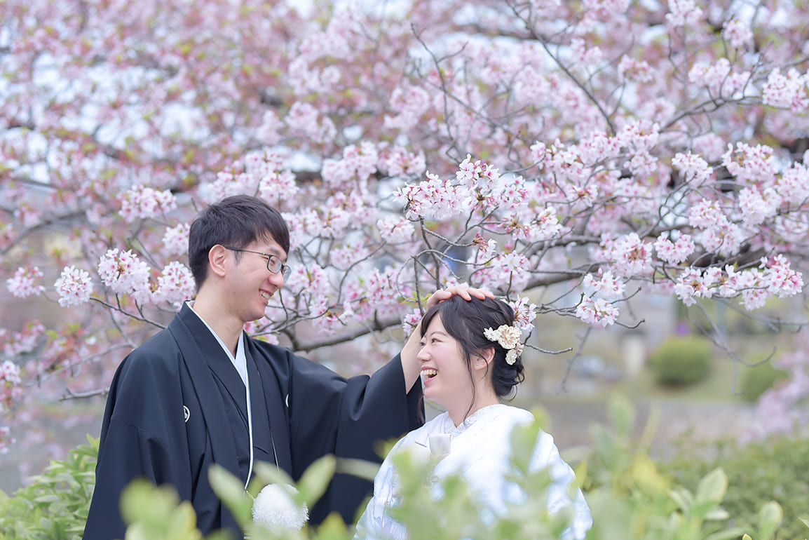 春の象徴である桜に包まれて撮影するウェディングフォトは、晴れやかな門出にふさわしい特別な一枚。