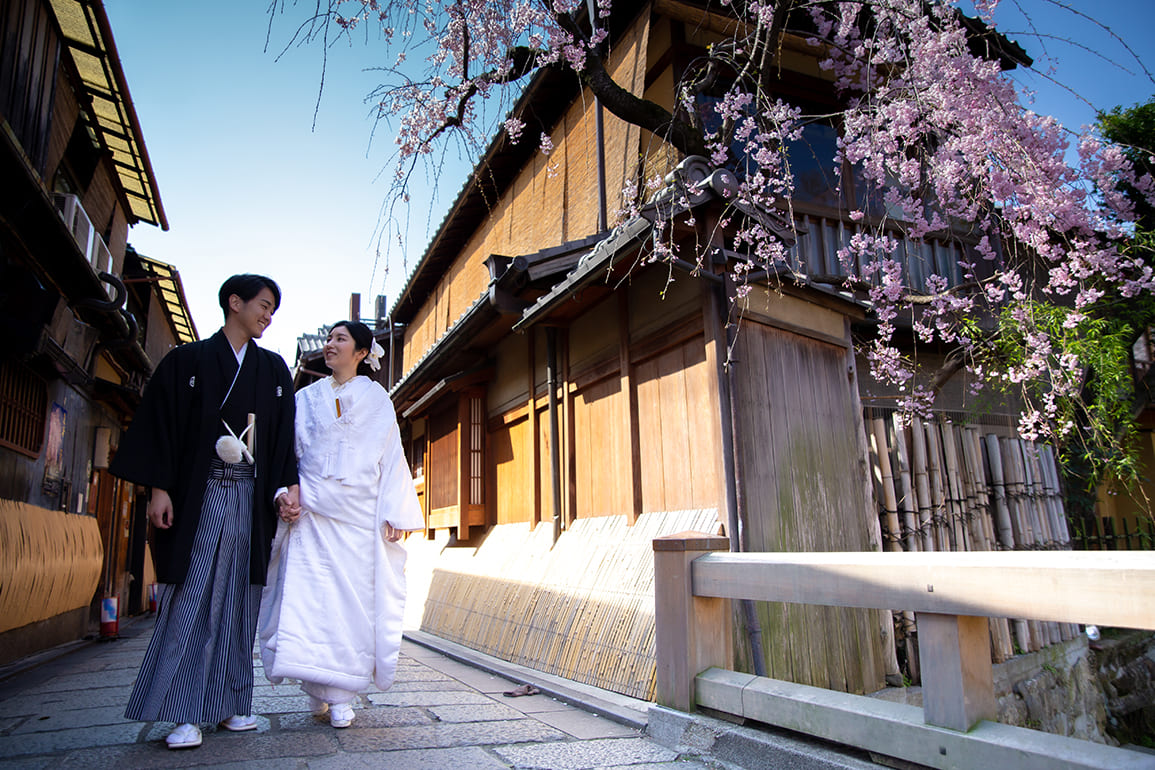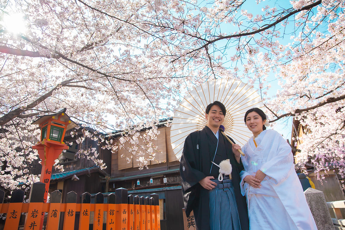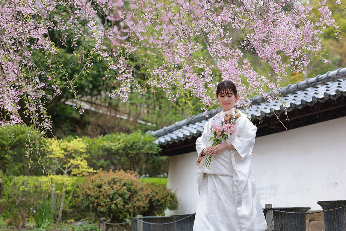 - 白無垢や色打掛と桜の組み合わせは王道の美しさ