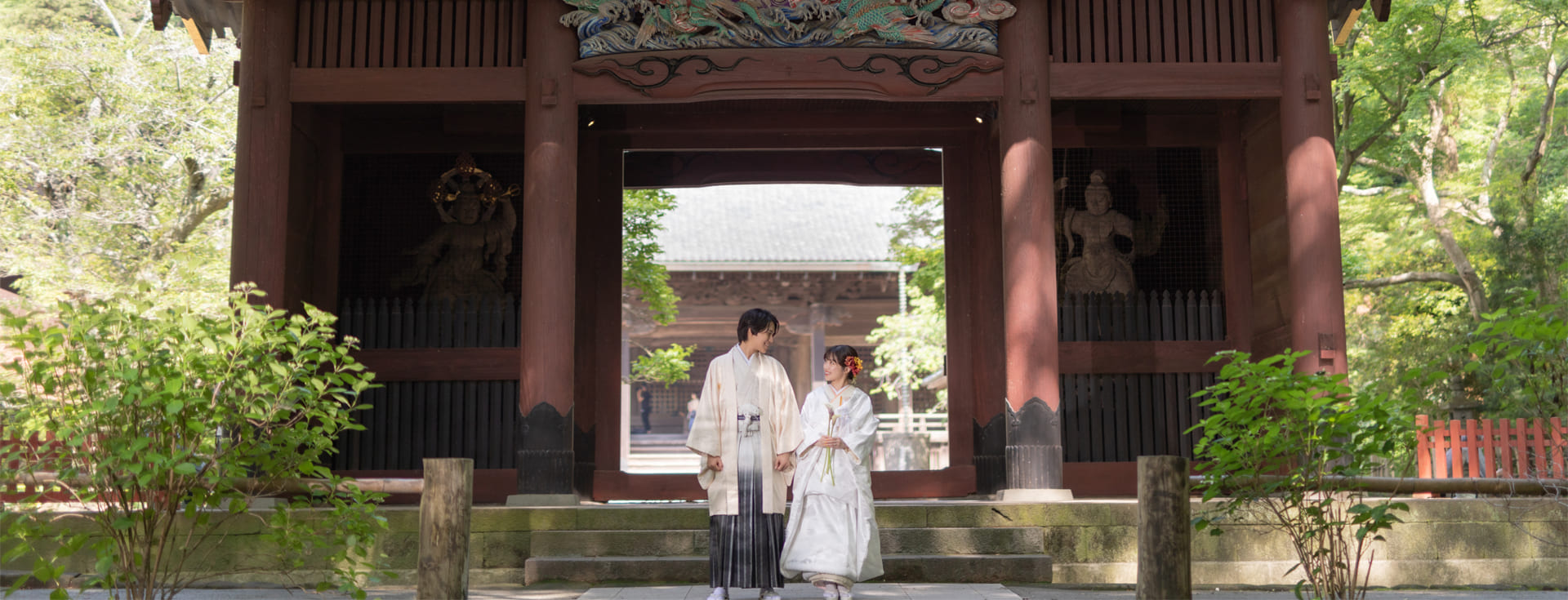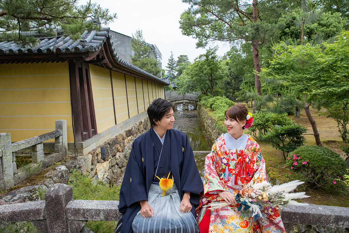 どんな和装でも似合うのが神社・寺院の魅力ですが、緑の木々が多い背景では白無垢の美しさが一層映えやすく清々しいお写真に。朱塗りの橋や鳥居、桜や紅葉を背景では華やかな柄の色打掛が背景に負けることなくより一層輝かしい印象のお写真になります。