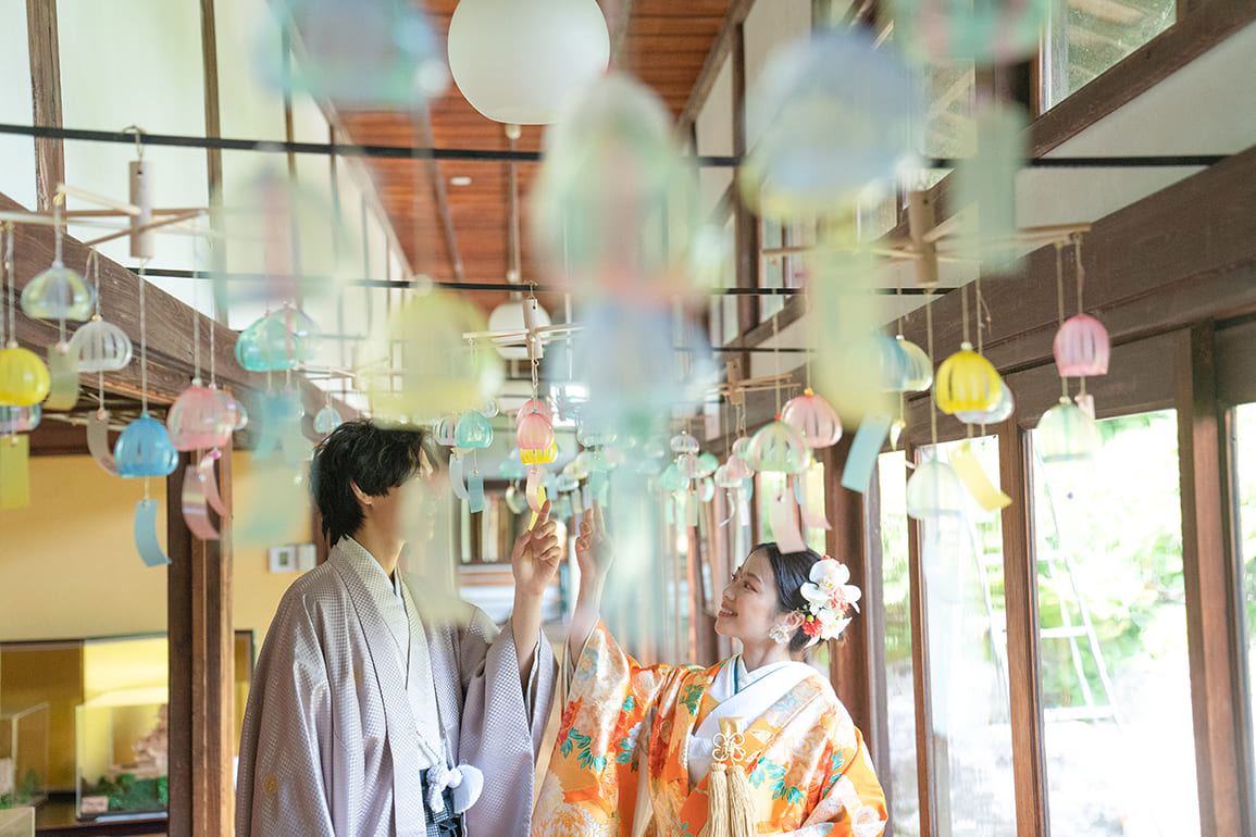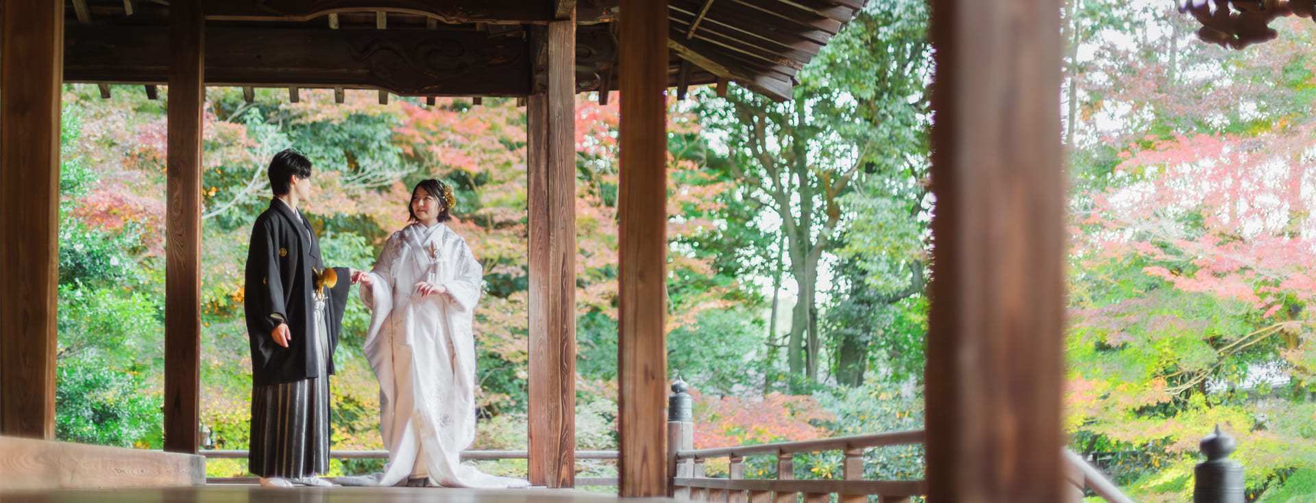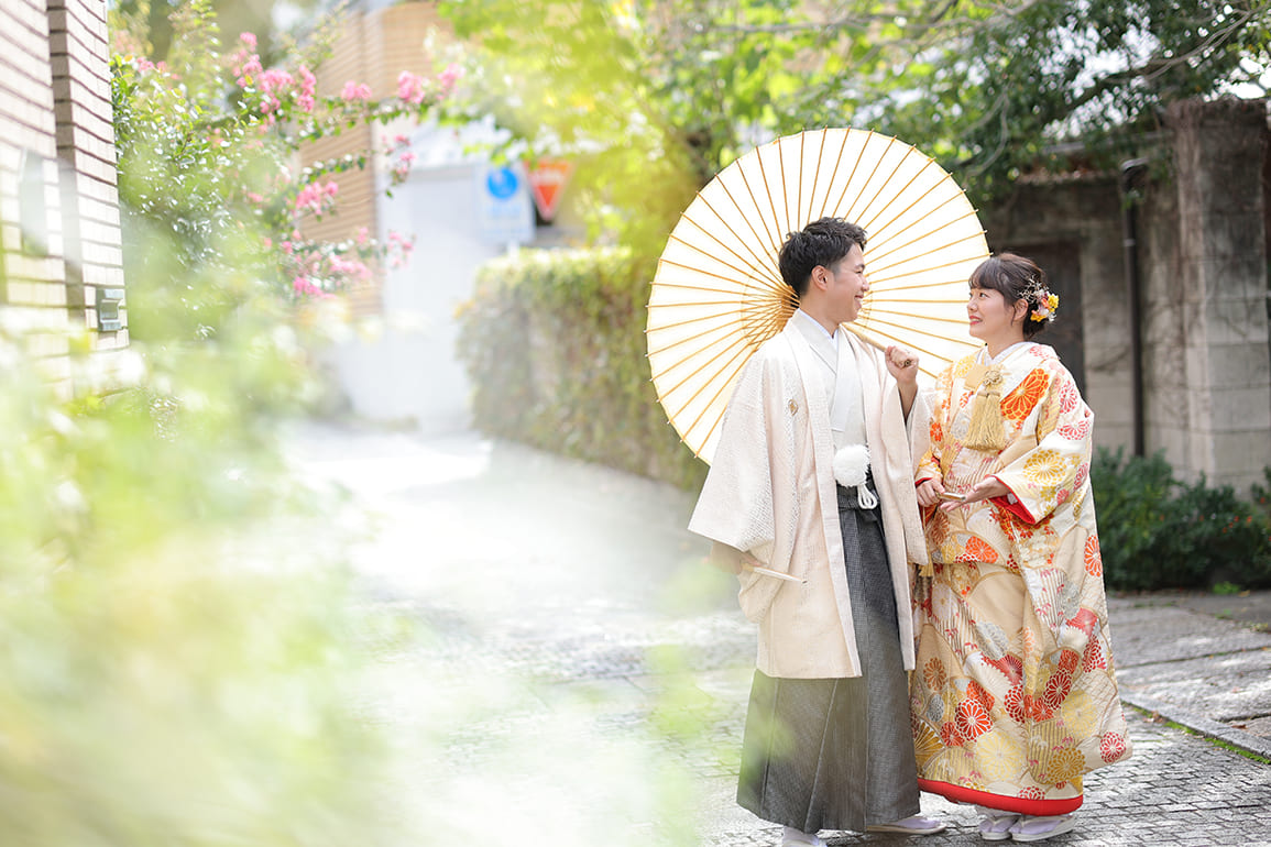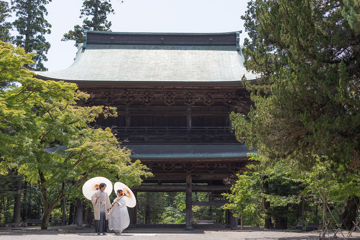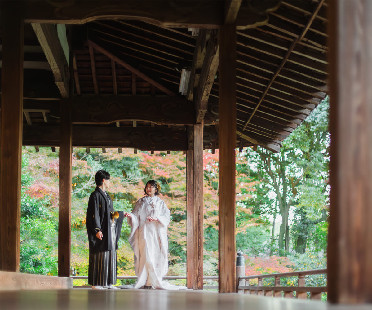 厳かで格式高い美しさと、静寂に包まれた神秘的な雰囲気の神社や寺院は、白無垢、色打掛、紋付袴といった和装の美しさが最も際立つロケーションです。桜や紅葉などの四季の移ろいなど自然の彩りを写真に取り込むことでより特別な一枚にもなります。
