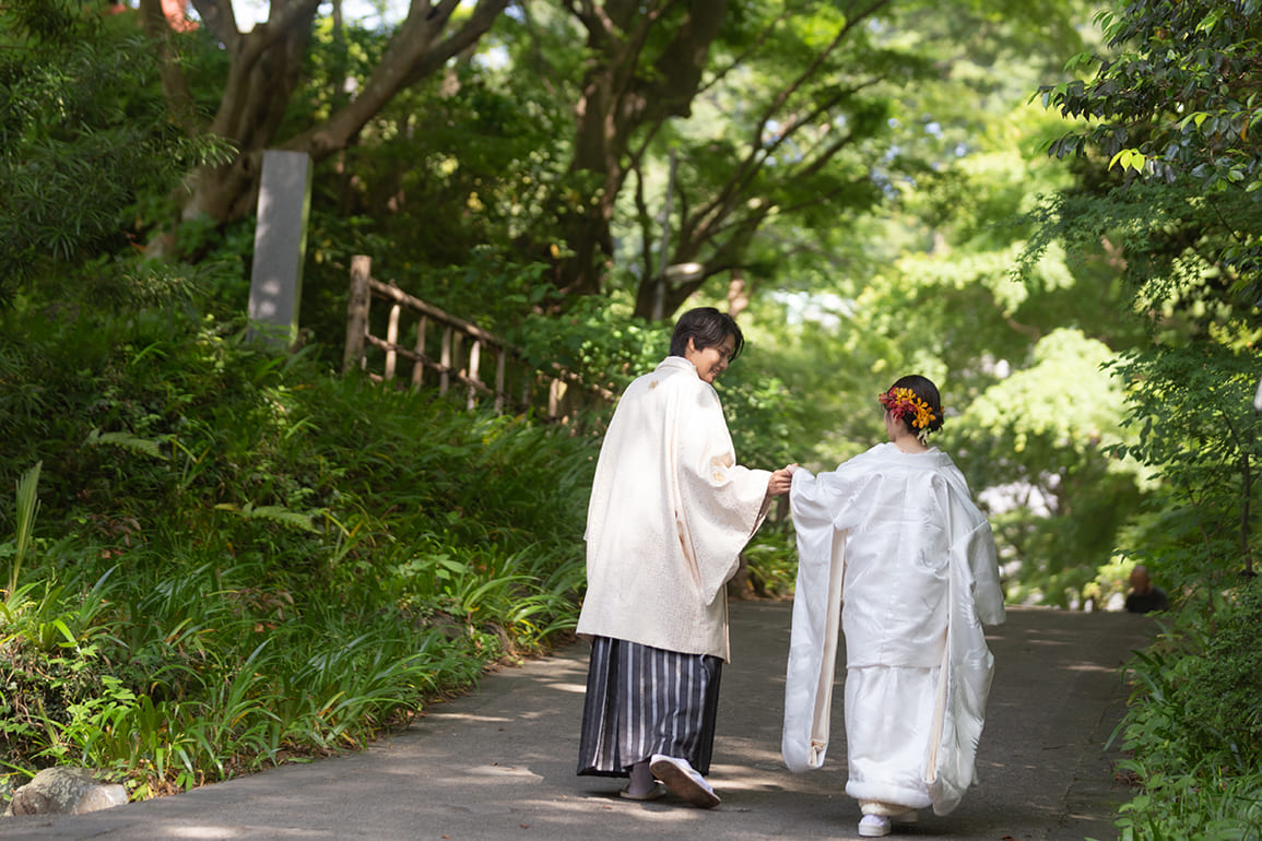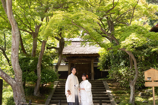 - どんな和装も引き立つロケーション。新緑の季節は白無垢もよく似合います