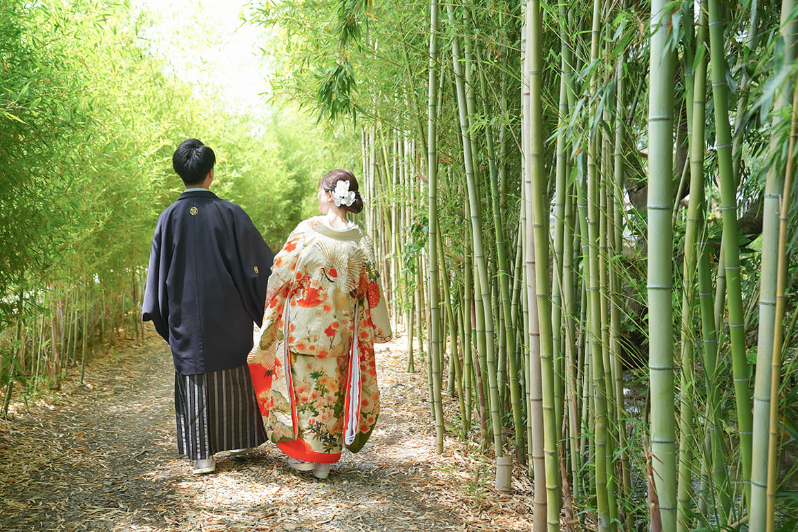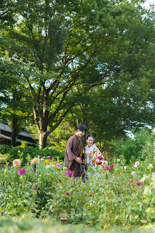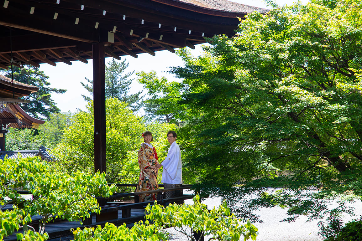 重ね着の多い和装は、屋外撮影での暑さの負担が大きくなります。和装は、冷房設備付きの和建築や庭園などを利用することで、快適に撮影していただけます。